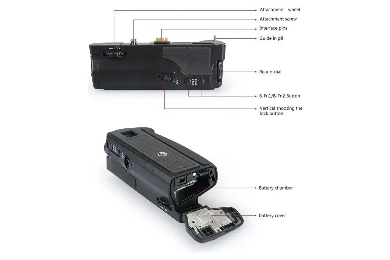 Батарейний блок HLD-7 для фотоапаратів Olympus EM-1. Корпус батарейного блока та прогумовані вставки мають ту саму фактуру, що й фотоапарат, завдяки чому батарейний блок із Вашою камерою має один цілий вигляд.