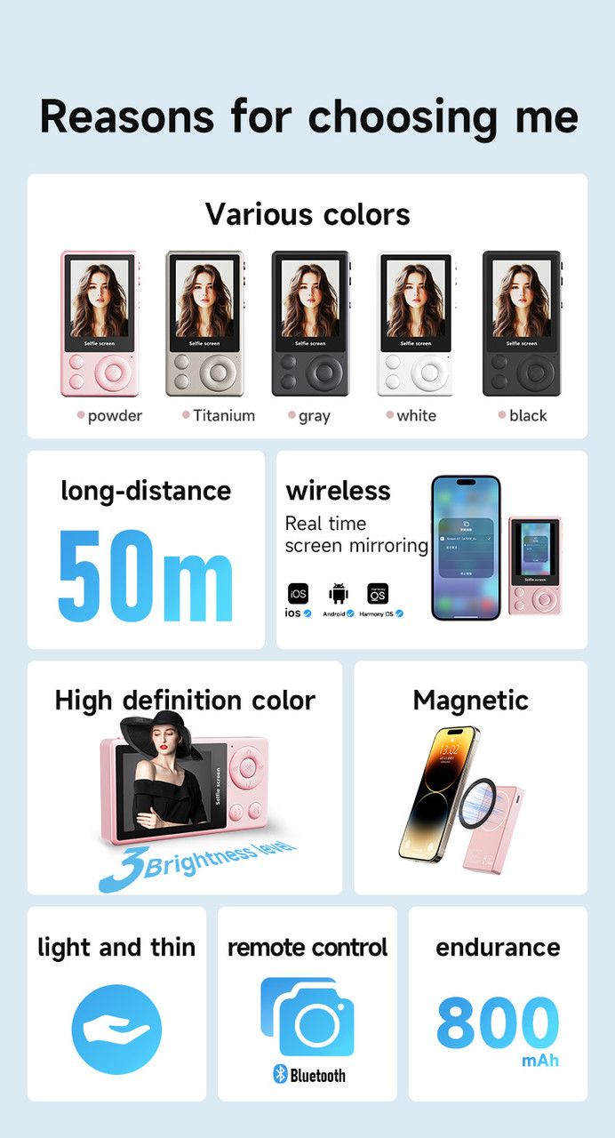 Отримуйте ідеальний кадр із задньої камери смартфона, не жертвуючи зручністю. A1 Vlog Selfie Monitor — компактний магнітний екран-помічник, який кріпиться до вашого телефона та показує прем'ю із задньої камери прямо перед вами. Знімайте влоги, ведіть прямі ефіри та робіть селфі професійної якості з різкістю й передаванням кольору основної камери.
