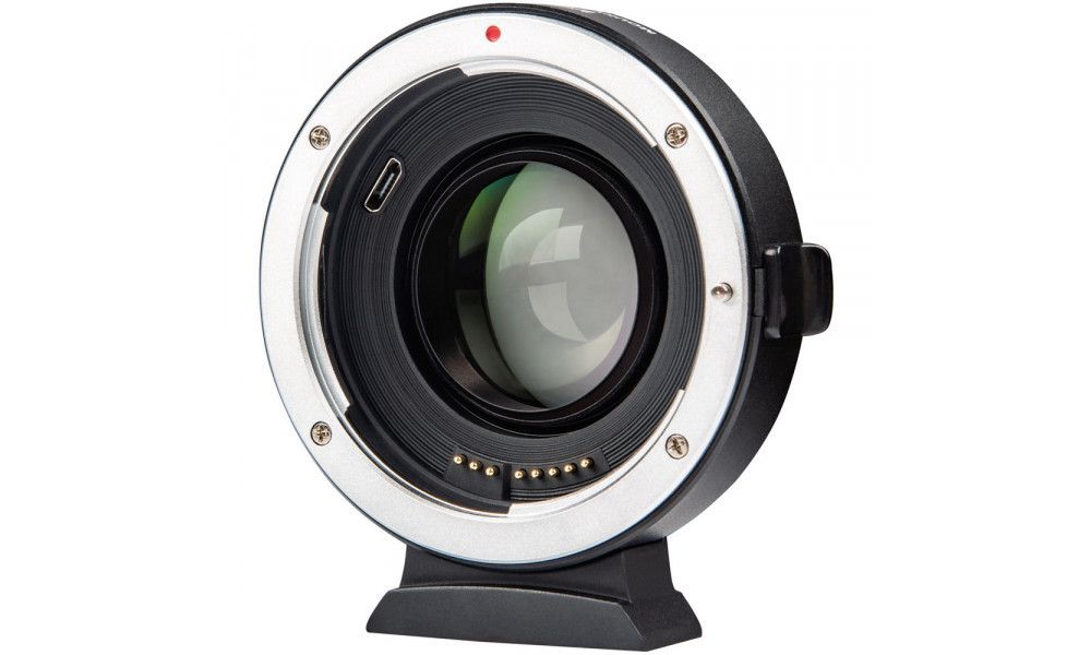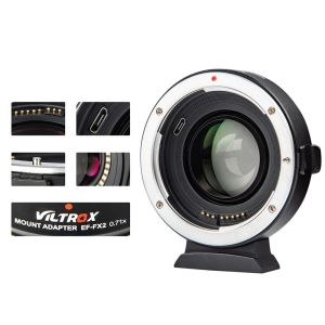 Адаптер Vildrox EFX2 Speed Booster для об'єктивів Canon EF/EF-S (без виступу задньої лінзи) або сумісної на байонет Fuji X-mount. Компенсація кроп-фактора камери (0,71) завдяки вбудованій високоякісній лінзі (4 елементи/4 групи) з антидруковим покриттям. Наприклад, для об’ єктива з фокусною відстанню 50m x 1.5 x 0,71 = 53.25mm, а також збільшення діафрагми на 1 стоп. Можливість налаштування розташування лінз для кращого налаштування на нескінченність.