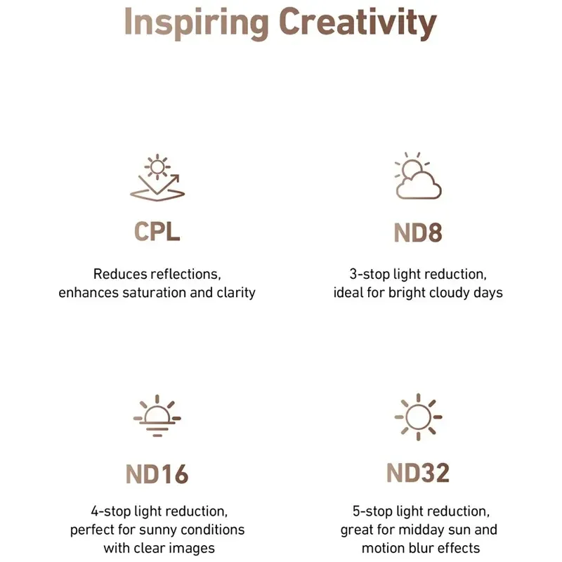 - Типи фільтрів: CPL, ND8, ND16, ND32