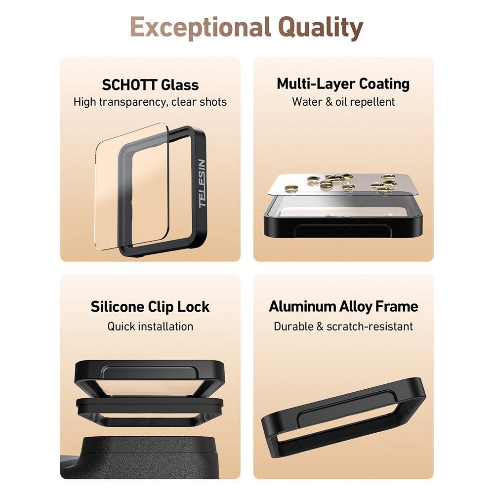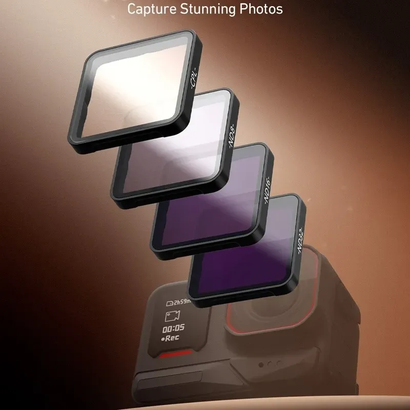 Набір фільтрів TELESIN S5-FLT-27-TIS розроблений для камер Insta360 Ace Pro и Ace Pro 2. До комплекту входять чотири фільтри: CPL (поліризаційні) и ND8 / ND16 / ND32 (нейтральні). Вони допомагають покращити якість знімання в різних умовах освітлення: знизити відблиски та підвищити контраст, контролювати експозицію на яскравому сонці, отримувати кінематографічні витримки та гарне розмиття руху. Швидке встановлення без інструментів, міцне оптичне скло та багатошарове покриття для захисту від подряпин і відбитків.