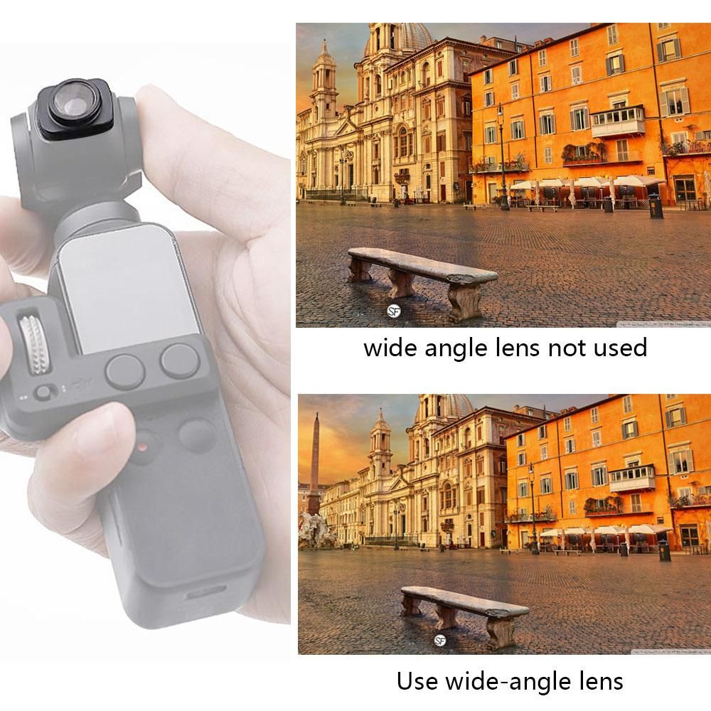Ширококутна посадка збільшує кут захоплення зображення вашої камери об’ єктива у 0,65 раз. Ця насадка розроблена спеціально для DJI OSMO POCKET, і розширює формат кадру без спотворень. Виготовлена з багатошарового оптичного скла в алюмінієвій оправі, кріпиться за допомогою магнітної основи. Це дозволяє розширити кут спостереження об’ єктива камери до 100 градусів, при цьому дисторсія повністю відсутня. За рахунок застосування магнітної основи - використання даної насадки дуже просте і розширює можливості Вашого об'єктива буквально миттєво.