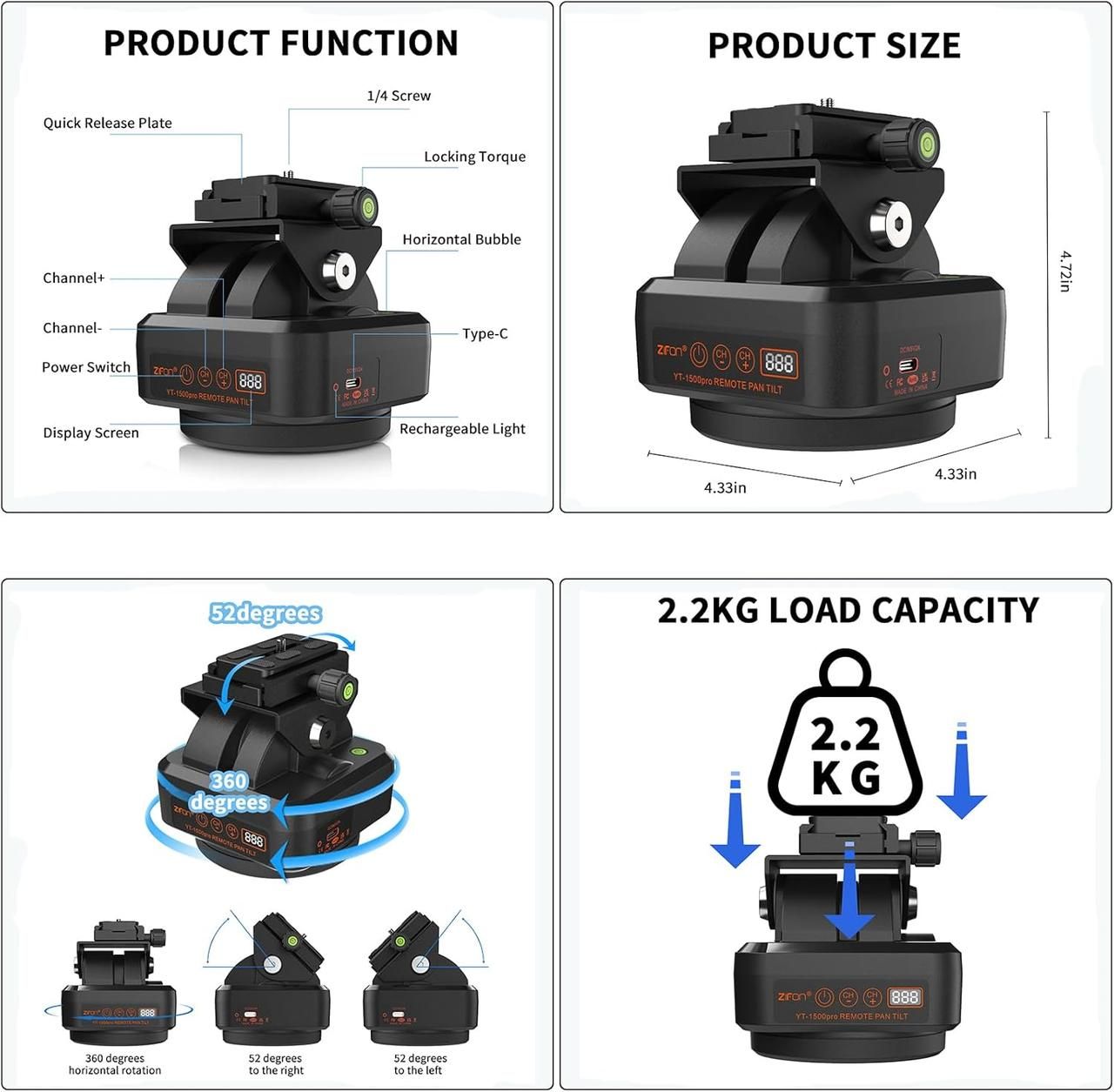 ZIFON YT-1500 Pro — це універсальна панорамна електрична поворотна головка, розроблена для фотографів і відеографів. Вона забезпечує точне обертання на 360 градусів, витримує навантаження до 2,2 кг і обладнана зручним бездротовим пультом дистанційного керування, що робить її ідеальним вибором для різних сценаріїв знімання, включно з покадровим зніманням, панорамним знімання та прямі трансляції.