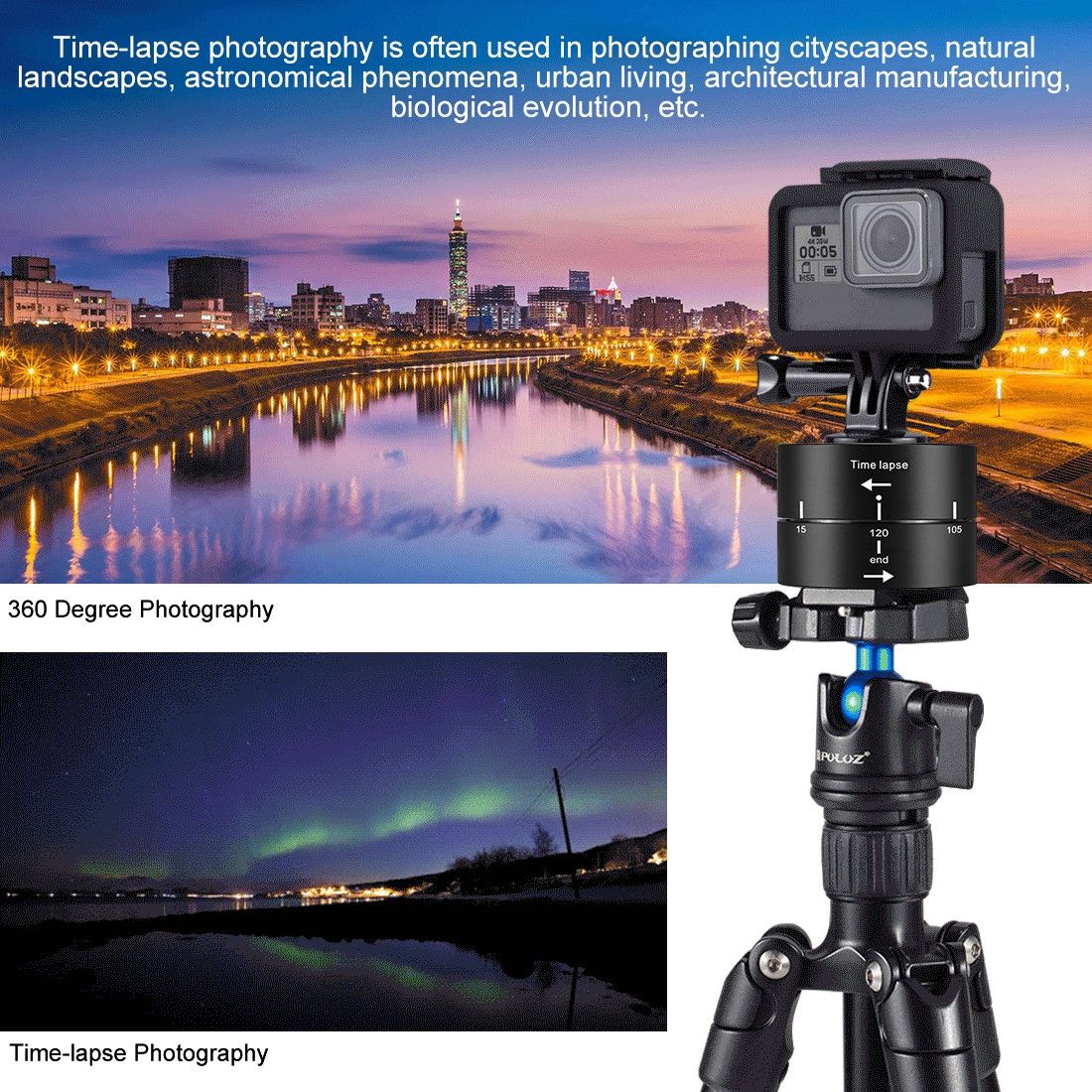 США таймлапс від Puz призначено для панорамної інтервальної зйомки телефоном, екшн-камерою, DSLR камерою загальною вагою не більше 1000г.