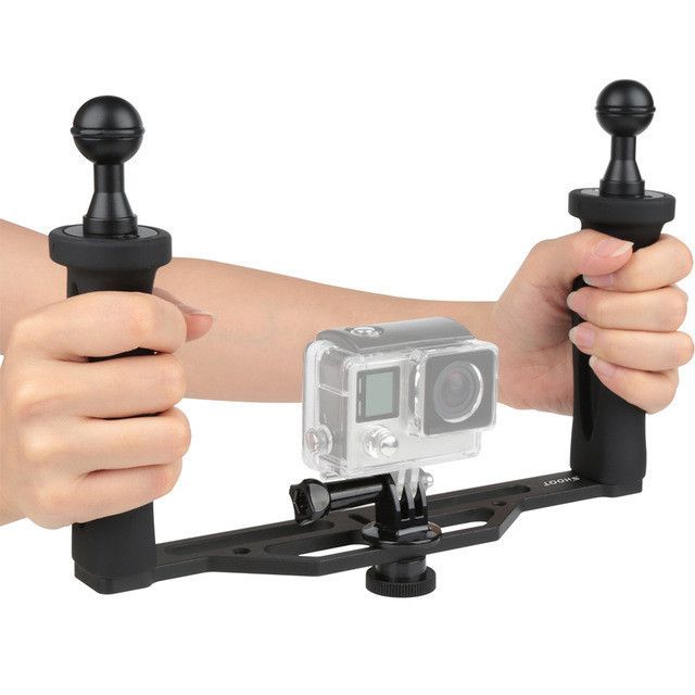 Дворучний держак для дзеркальних, беззеркальних камер, екшн-камер і відеокамера. Підходить для всіх пристроїв з штативним кріпленням 1/4. Також чудово підійде, як держак для купола-сфери (Dome Port). Съемка Якщо використовувати цей власник набагато стабільніший. Ергономічні не ковзають ручки. Матеріал: алюміній.
