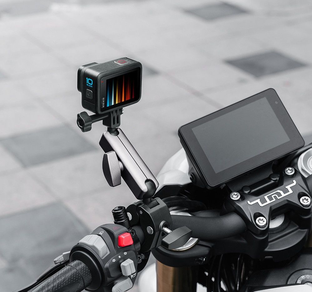 Потужна струбцина для встановлення камери на кермо мотоцикла, велосипеда або іншу трубу. Може використовуватися для встановлення не тільки камер GoPro та інших, екшн-камер, а й телефонів та інших невеликих відеокамер і фотоапаратів. Металева шарнірна головка дає можливість повороту камери в будь-який бік під будь-яким кутом. Кронштейн виготовлений з алюмінієвого сплаву.
