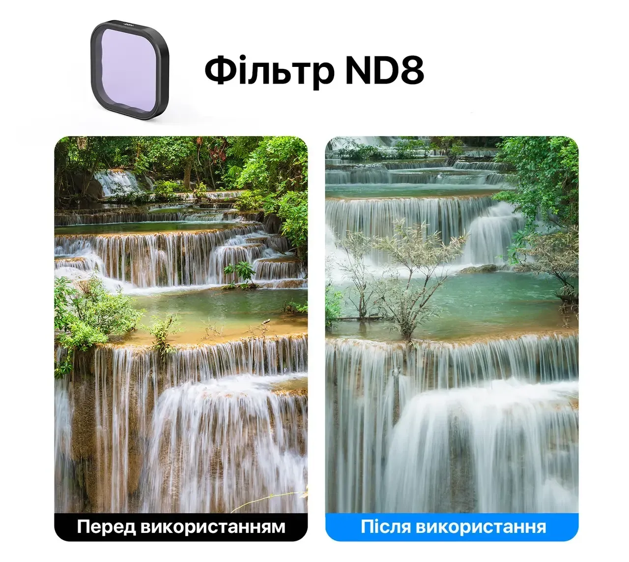 Фільтр нейтральної щільності ND8-32 дає змогу регулювати кількість світла, що надходить, що особливо корисно під час знімання з низькою частотою кадрів (наприклад, 24fps), коли важливо зберегти природну витримку. ND8 зменшує світлопропускання втричі та підходить для знімання в хмарну погоду, ND16 затемнює вчетверо й ідеально підходить для яскравого дня, а ND32 скорочує світловий потік уп'ятеро, забезпечуючи ідеальну картинку навіть за інтенсивного сонячного світла.
