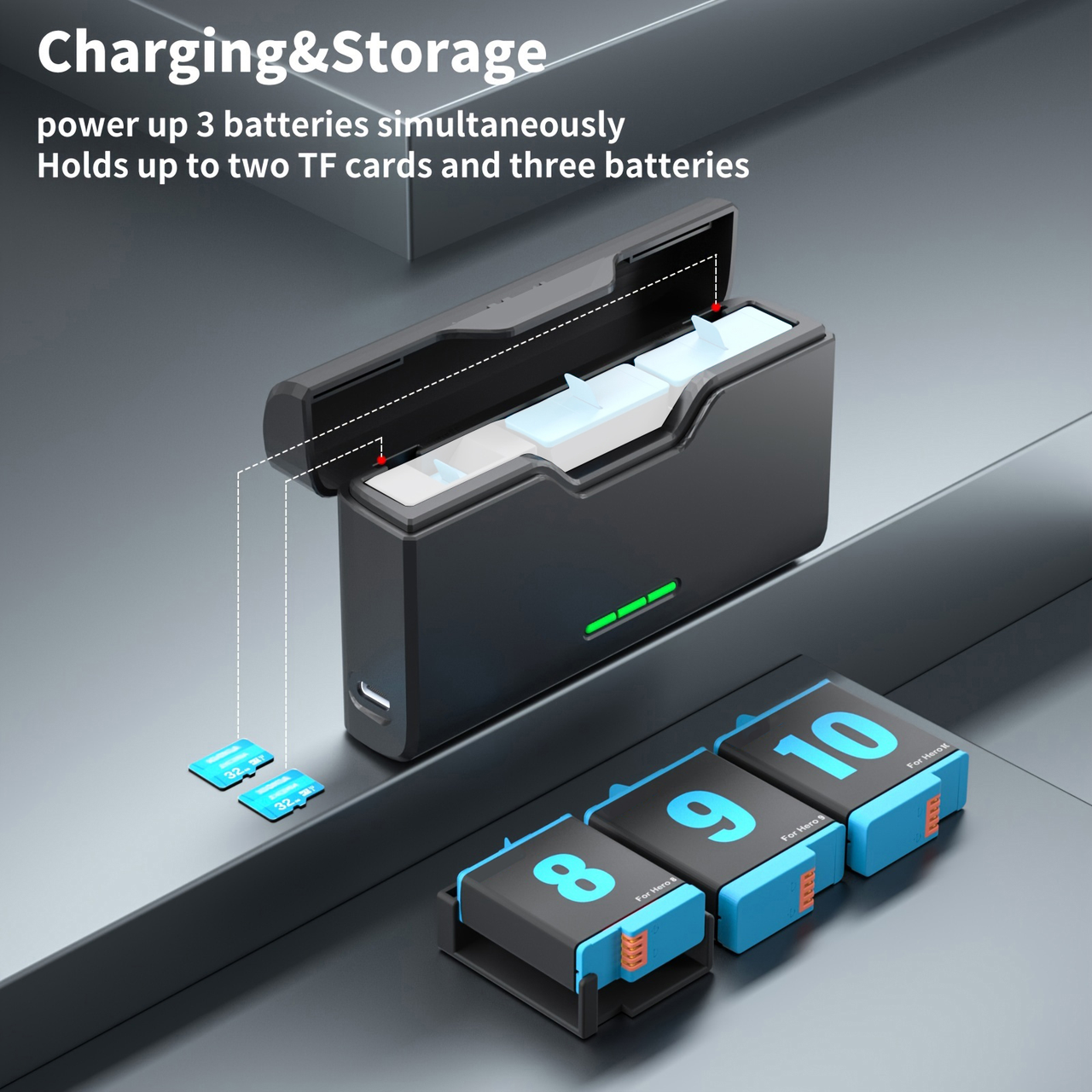 Універсальний зарядний пристрій — бокс для зберігання акумуляторів GoPro Hero 5, 6, 7, 8, 9, 10, 11, 12 (AHDBT-501, AHDBT-801, AHDBT-901, AJBAT-001, ADBAT-001, SPBL1B) обладнаний трьома слотами, сумісними з усіма типами акумуляторів як оригіналами, так і аналогами. Аксесуар підтримує максимально можливе швидке заряджання для оригінальних акумуляторів загальною потужністю 12 Вт. Цей пристрій може бути застосований до всіх камер GoPro, починаючи з 5 — для встановлення акумуляторів від GoPro 5, 6, 7, 8 використовуються спеціальні вставки для камер, починаючи з 9 — бокс використовується без них |