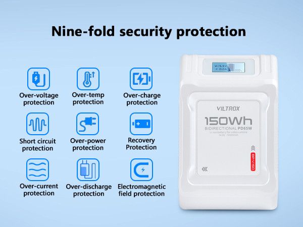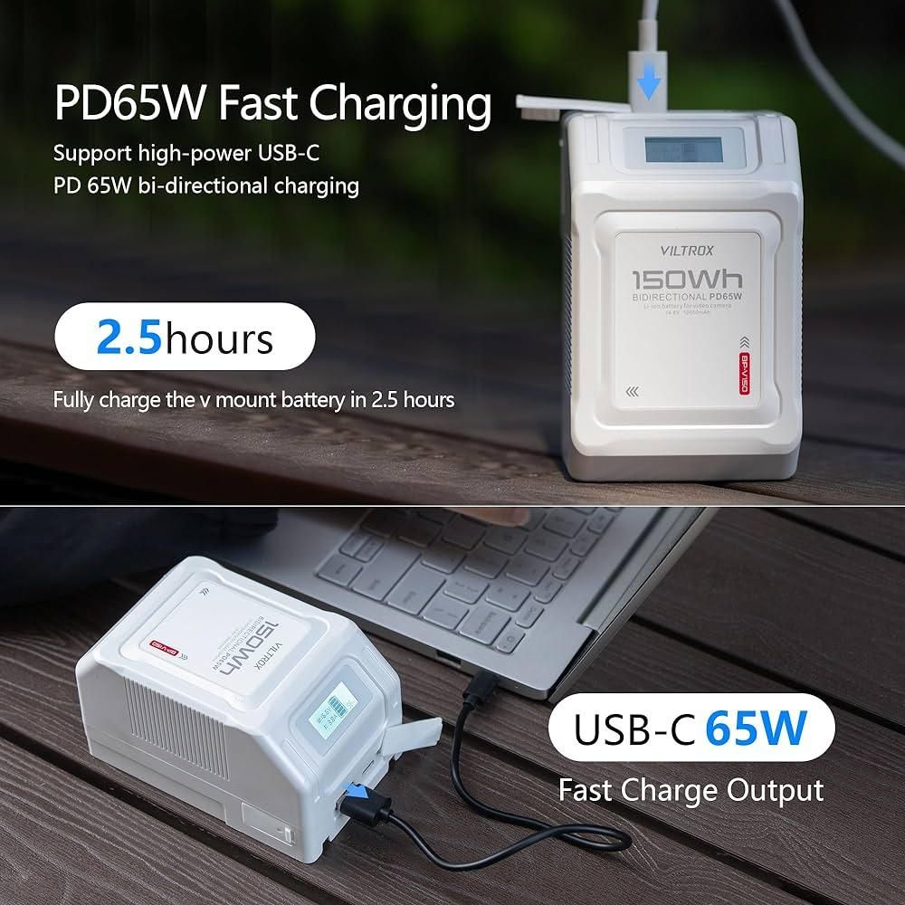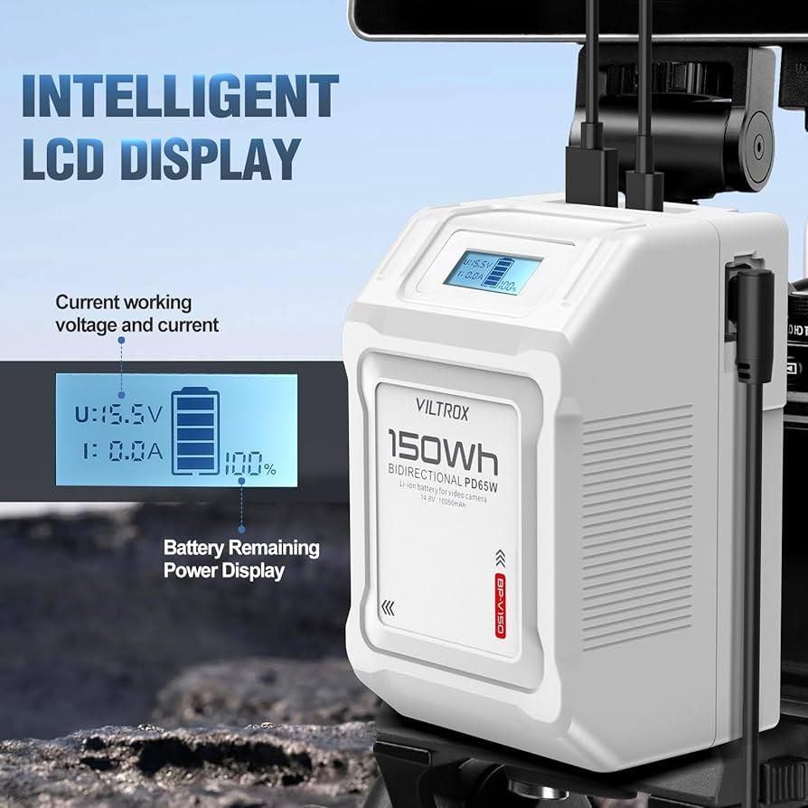 Viltrox BP-V150 обладнаний літій-іонним акумулятором ємністю 150 Вт·год, 1050 мА·год/14,8 В, а також двоспрямованим входом/виходом USB-C потужністю 45 Вт, який дає змогу заряджати ноутбуки, смартфони, планшети тощо. до. Ви також можете використовувати його для живлення камер, аксесуарів, бездротових передавачів зображень, джерел світла тощо.
