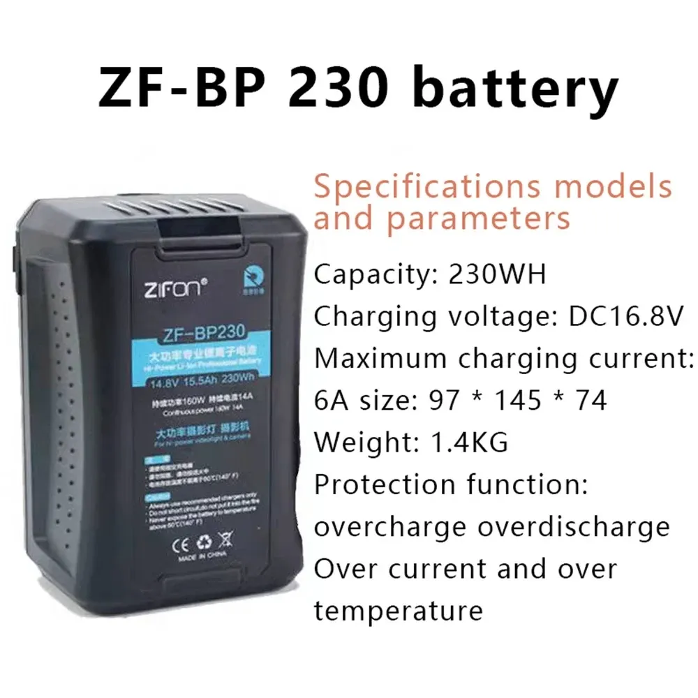 Акумуляторна батарейка Zifon ZF-BP230 V-Mount 230Wh 15500mAh 14.8V — призначена для професійних камер і обладнання, яке використовують IDX V-Mount (V-Lock) систему: Sony, Red, Canon, Arri, Blackmagic, Panasonic, JVC та ін. Акумулятор обладнаний USB и D-Tap портами, що дають змогу використовувати акумулятор як зовнішнє джерело живлення для пристроїв різного типу.