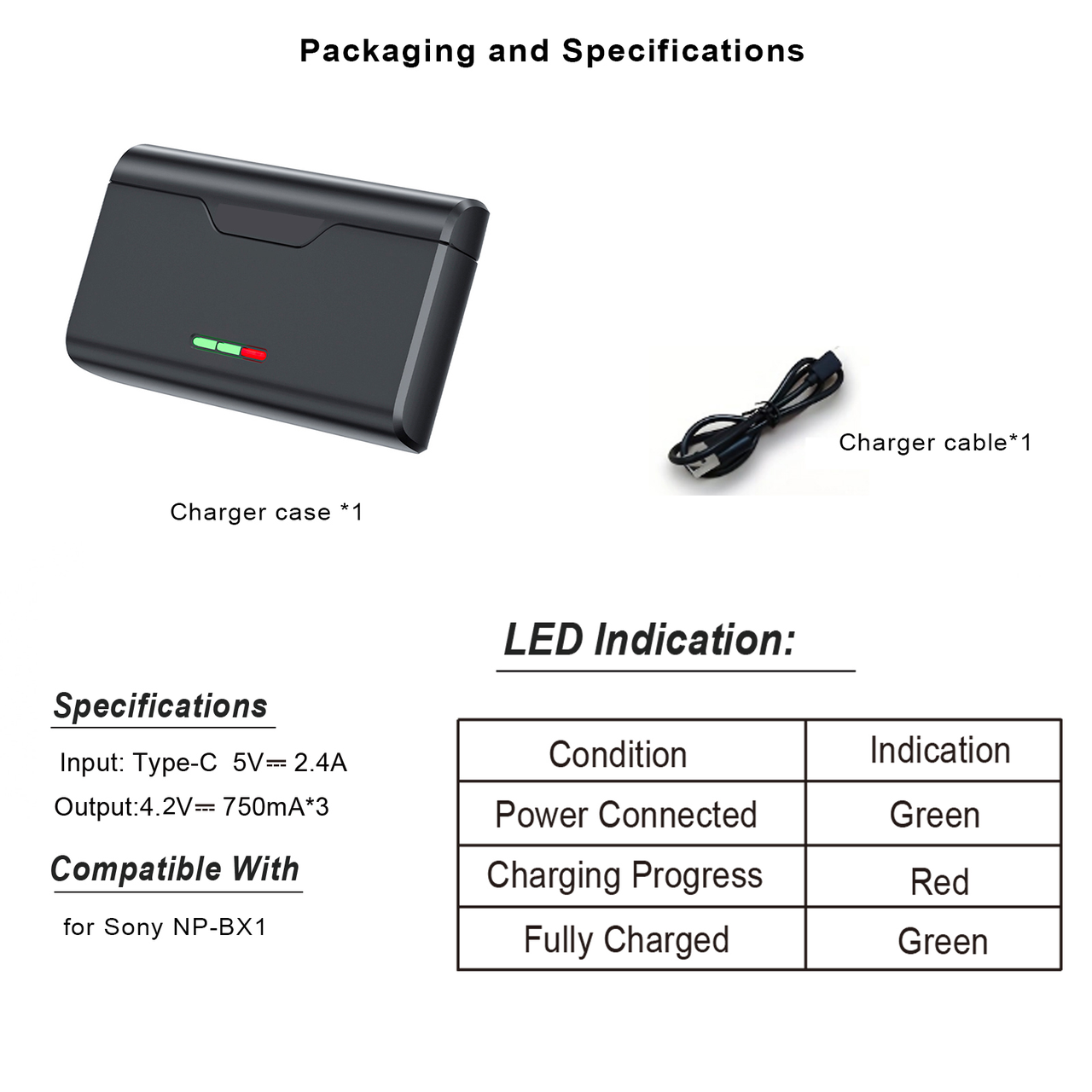 Зарядний пристрій — бокс для зберігання акумуляторів NP-BX1 обладнаний трьома слотами, сумісними з усіма типами акумуляторів як оригіналами, так і аналогами. Аксесуар підтримує максимально можливе швидке заряджання для акумуляторів загальною потужністю 12 Вт. Цей пристрій можна застосувати до всіх камер з акумулятором NP-BX1. |