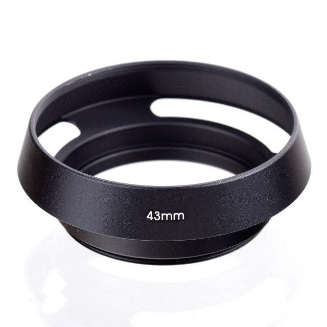 Металева бленда 43ммм. Підходить на всі об'єкти з діаметром передній лінзи 43мммм. Металева, легка і надійна вентиляційна бленда з різьбленням для світлофільтрів на зовнішньому боці. Форма "Обратний конус" створює додатковий захист передній лінзи об'єктиву від паразитних променів. Можна використовувати совесно з Пакунок 52 мм або такий.