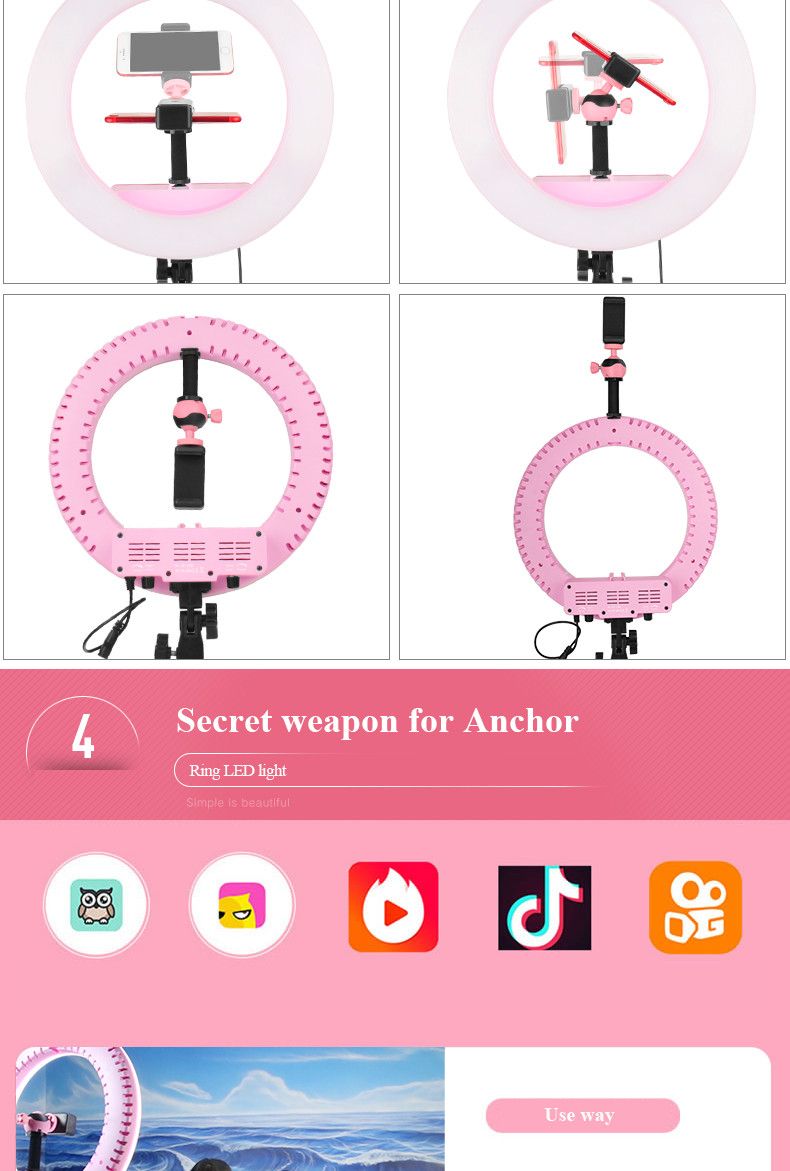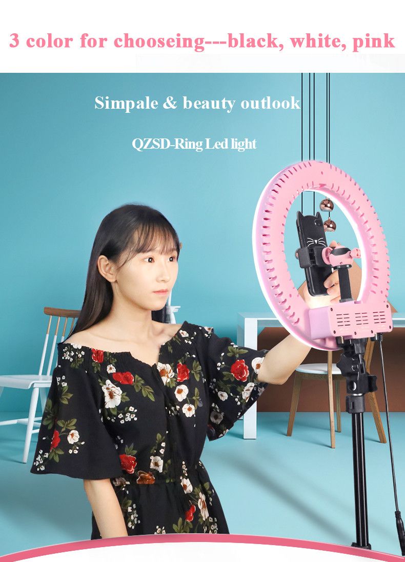 Кольцевий LED підсвічування від QZSD з димером і штативом призначена для знімання фото і відео в напрямку портрету, фешн, б'ють і навіть селі. Ця модель не має додаткових рамок у конструкції, отже знімання ведеться зсередини кола. Таким чином світло рівномірно поширюється на модель (об’єкт знімання) і ми отримуємо без темного освітлення. Наручний розмір - 350 мм, внутрішній - 220 мм. Цей розмір достатньо для отримання красивих блиц в очах моделі при зніманні великого портрета. Для більшого розсіювання і відсутність точкових блисків від диодних ламп, зовнішня панель зроблена з білого матового пластику низької щільності, що виконує роль дифузора. Димер призначено для зміни яскравості.