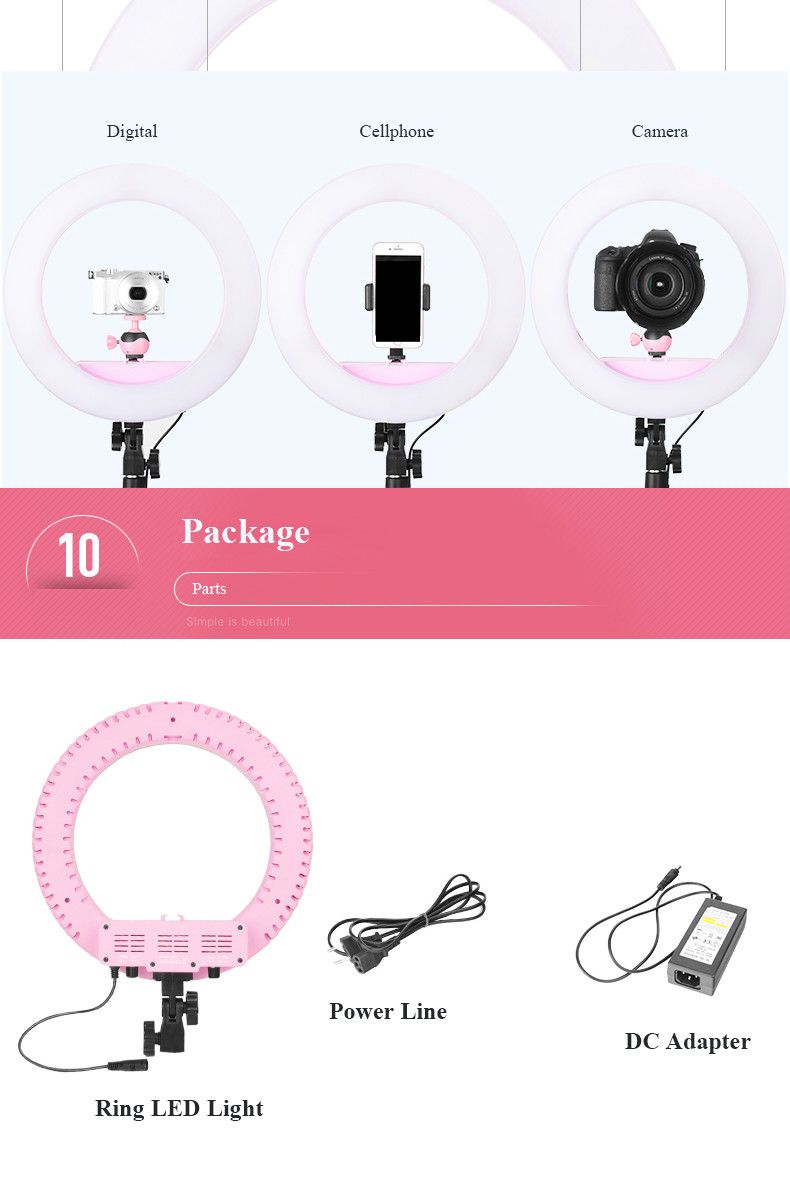 У кільцому світлі всі 240 Диодні лампи з кольоровою температурою 5500K, що дозволяє нам отримати максимум потужності. 5500K - це кольорова температура сонячного дня або студійної спалахи. Димеричне регулювати температуру кольорів у діапазоні 3200K-5500K. Також перевага цієї моделі полягає в наявності штатива (стійки) і дзеркала.