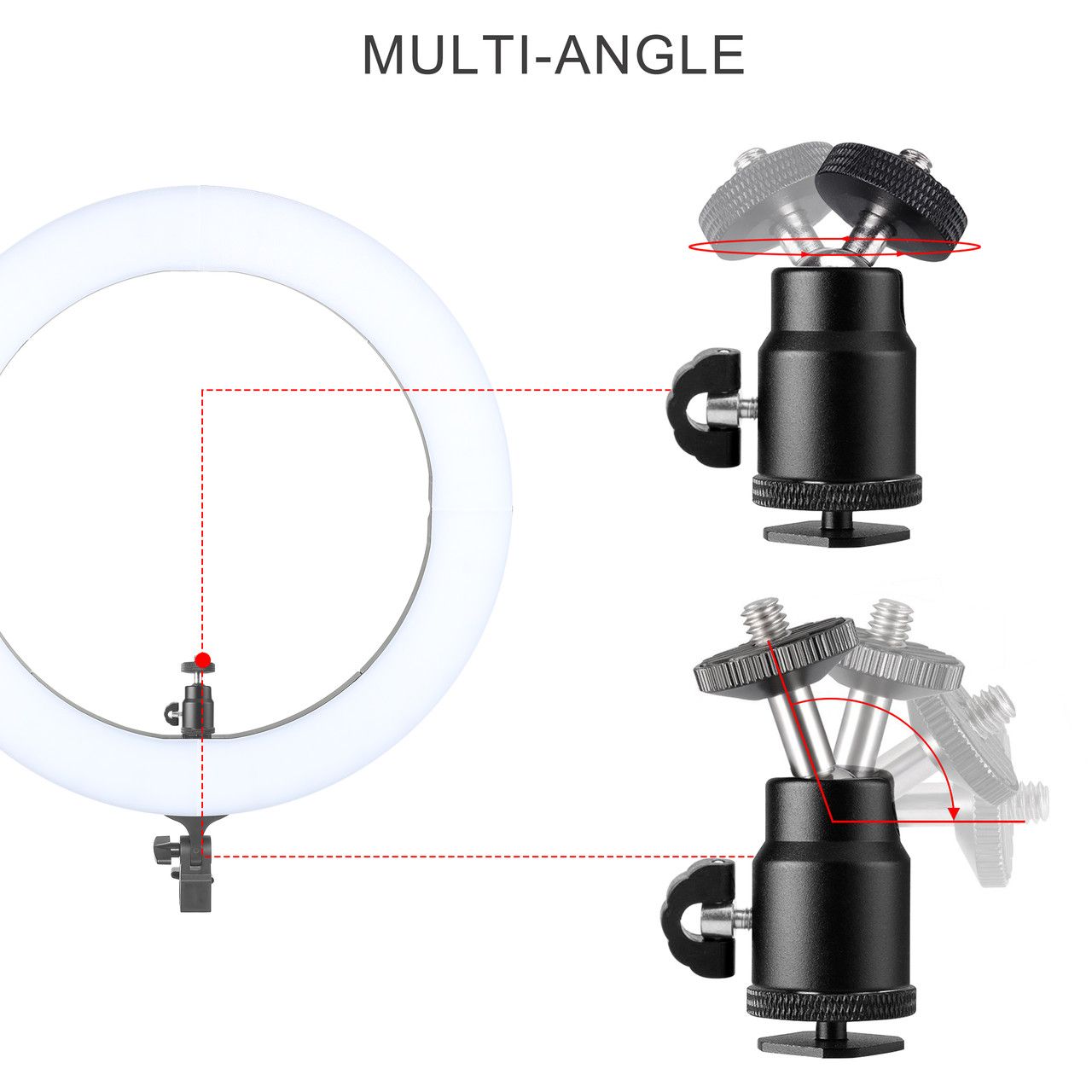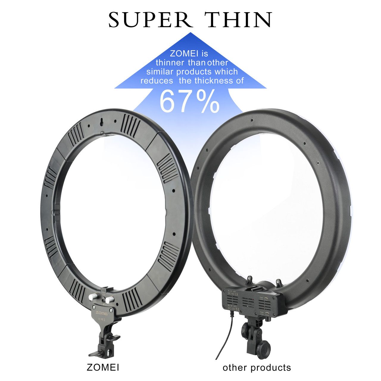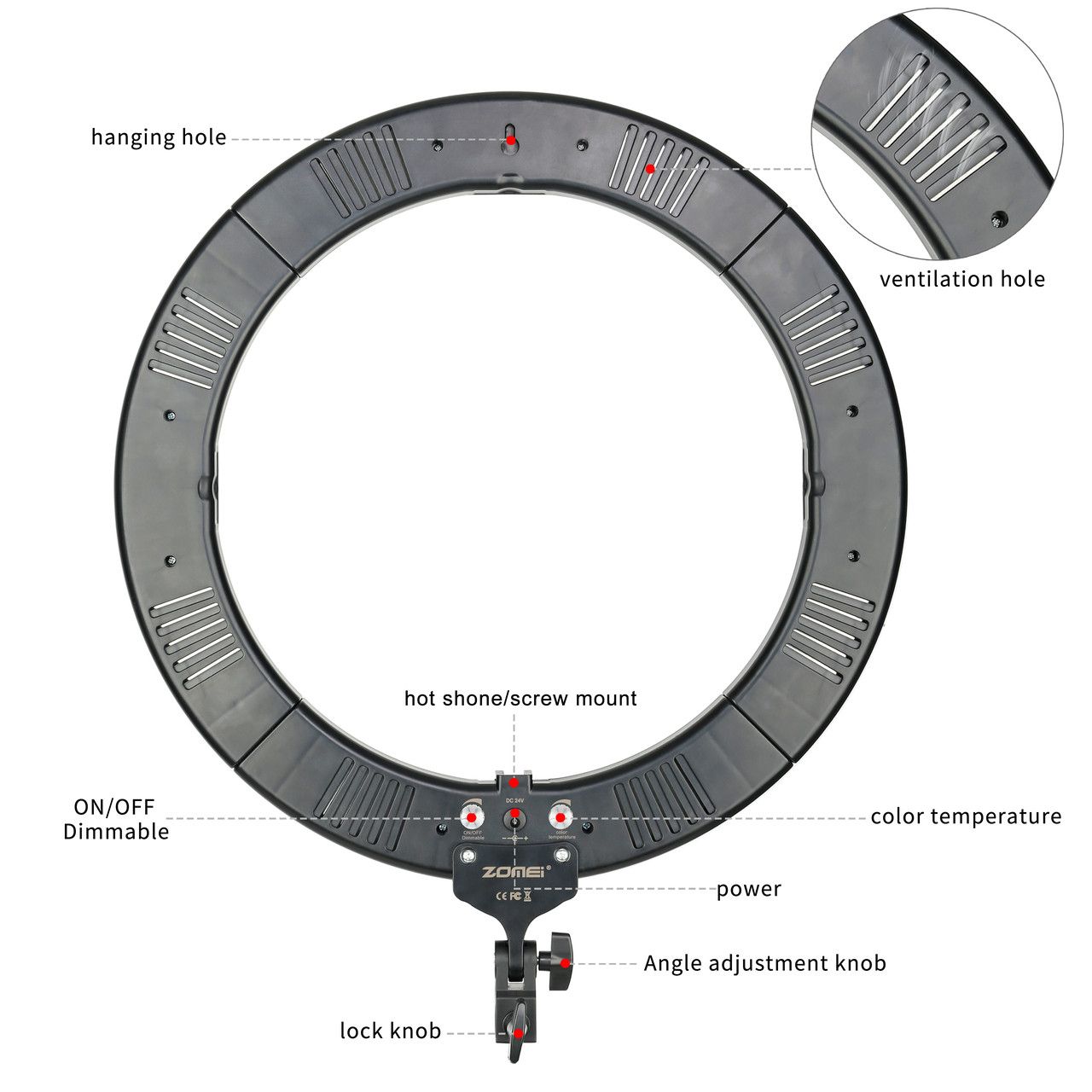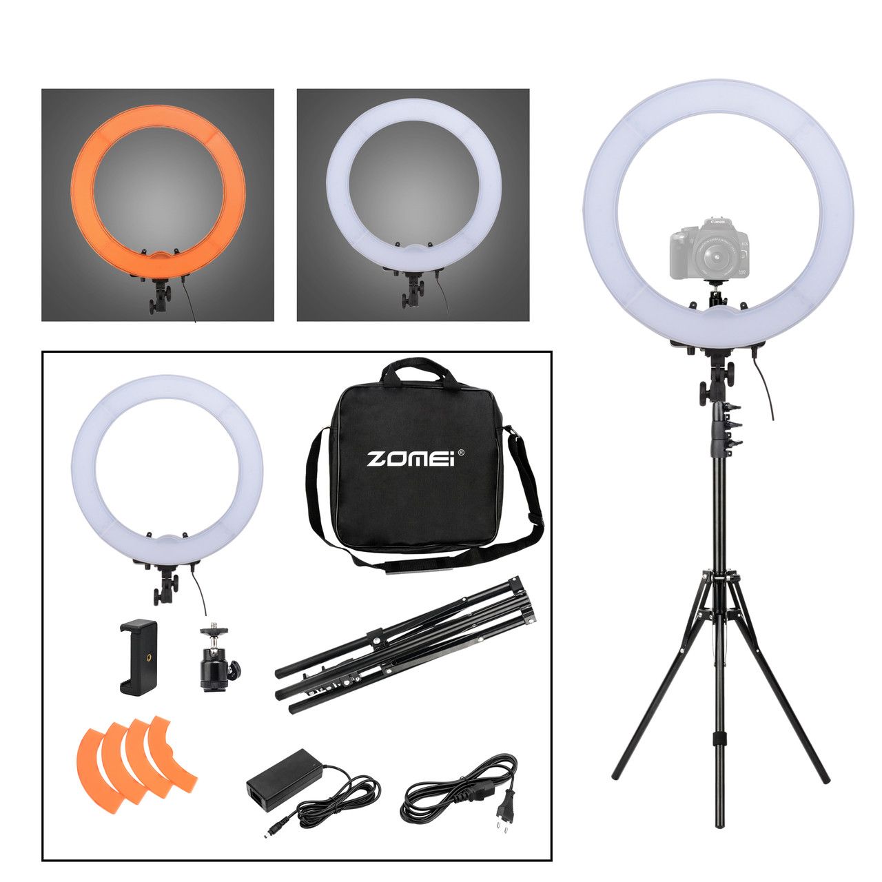 Кольцевий LED підсвічування від ZOMEI з димером призначена для знімання фото і відео в напрямку портрету, фешн, б'ють і навіть селі. Ця модель йде в комплекті з стійкою (з можливістю максимальної висоти - 180 см) Не має ніяких додаткових рамок у конструкції, таким чином знімка ведеться зсередини кола. Таким чином світло рівномірно поширюється на модель (об’єкт знімання) і ми отримуємо без темного освітлення. Цей наручний розмір - 490 мм, внутрішній - 360 мм, достатньо для отримання красивих блиц в очах моделі при зніманні великого портрета. Для більшого розсіювання і відсутність точних блисків від диодних ламп, зовнішня панель зроблена з білого матового пластику низької щільності, яка виконує роль дифузора в комплекті є тепловим фільтром. Димер призначено для зміни яскравості.