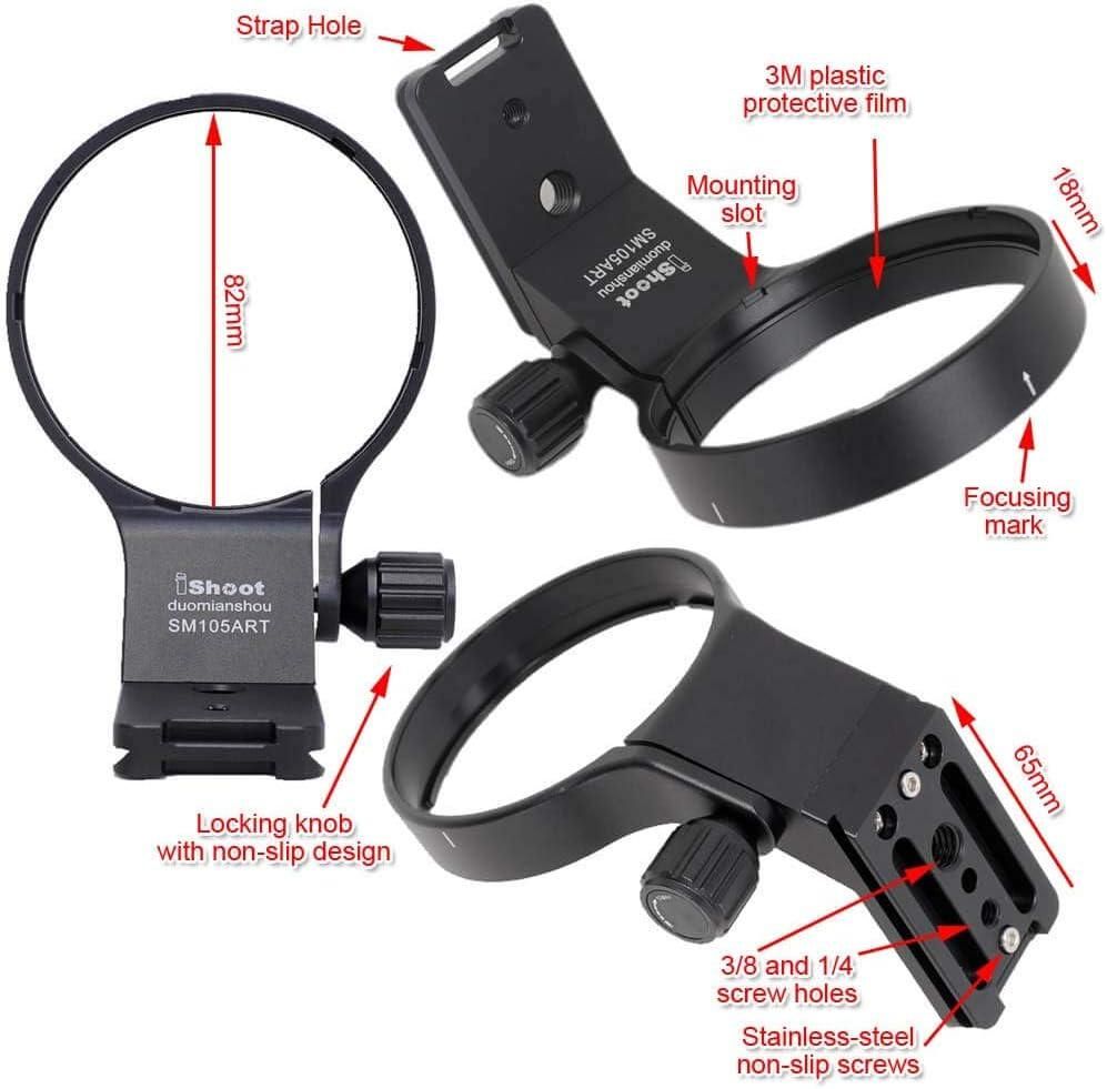 Штативне кільце SM105ART від ISHOOT призначене для надійного встановлення об'єктивів на штатив із балансуванням і підвищеною стійкістю, оптимально підходить для довгофокусної оптики Sigma.