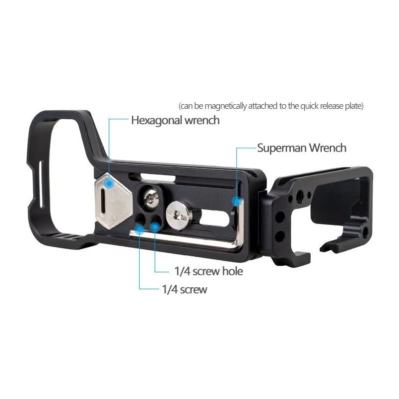 Особливості: Дає змогу встановити камеру як у горизонтальному, так і вертикальному положенні Матеріал — авіаційний алюміній для міцності та довговічності Модульна структура для легкого індивідуального настроювання. Регульоване положення крайки дає змогу підлаштувати необхідне положення. Гумова накладки для додаткового захисту камери Гвинт із неіржавкої сталі/міцний і довговічний Не створює перешкод і перешкод для використання фліп-екранів Забезпечує легкий доступ до акумуляторного відсіку камери