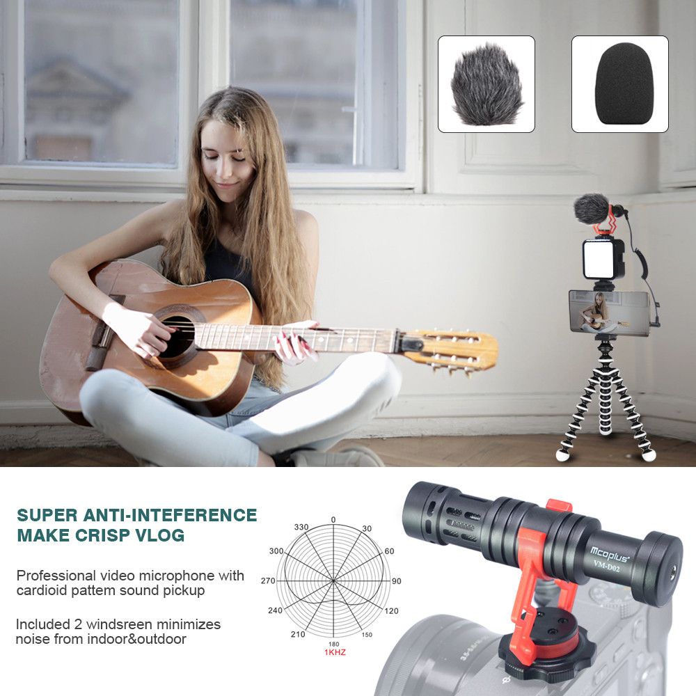 Спрямований накамерний мікрофон VM-D02 дасть змогу вам істотно поліпшити якість звуку під час знімання відео. Мікрофон допоможе досягти природного, чистого звучання з чудовою чіткістю, забезпечує високу чутливість, широкий діапазон частот, а також запис звуку на більшій відстані. Мікрофон фіксується на гарячому черевику камери або іншому аксесуара (штатив, стійка тощо) наявних різь 1/4". ). До комплекту входить вітрозахист — що дає змогу отримати гарний результат під час записування на вулиці, а також кабель як для камери 3.5 mm TRS (mini jack) і для смартфона 3.5mm TRRS (mini jack).