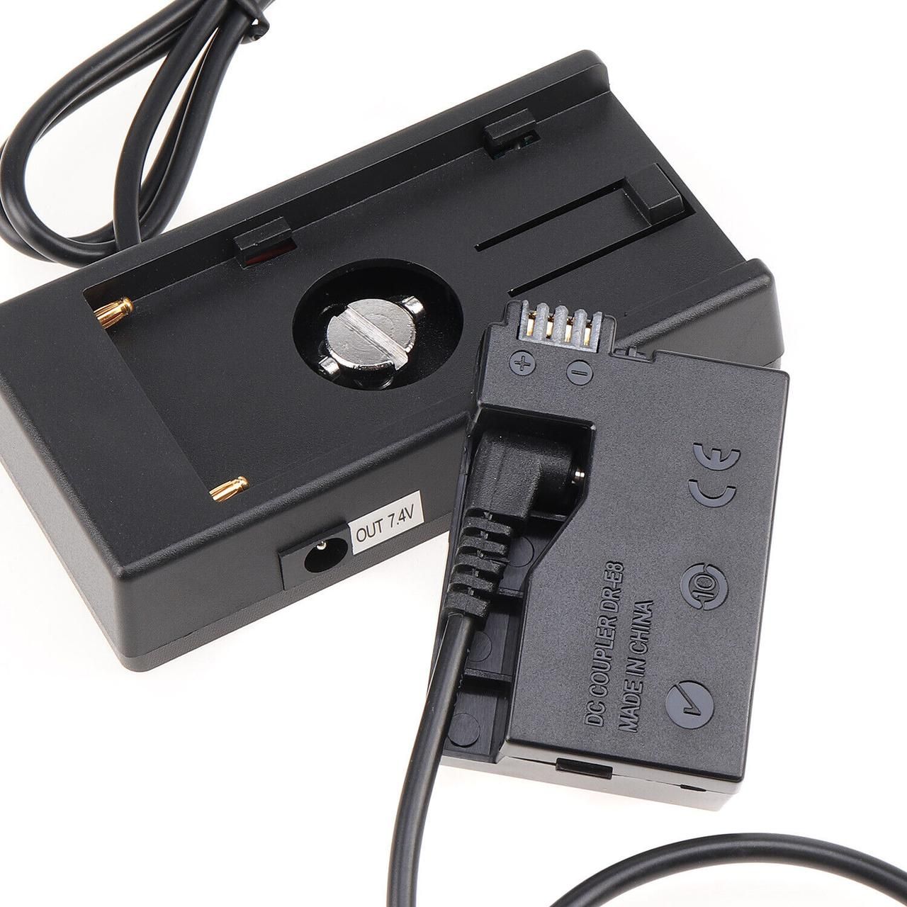Адаптер для батарей NP-F і муфта для Canon LP-E8 розроблені для збільшення часу автономної роботи вашої камери завдяки акумулятору Sony NP-F серії. Він має різні вихідні порти, вихідний порт 7,4 В (постійного струму (5,5/2,1 мм))  і USB роз'єм. Зі встановленим акумулятором цей адаптер можна використовувати як Powerbank. Він обладнаний світлодіодним індикатором, який загоряється червоним, коли рівень заряду батареї менш ніж 30 відсотків. Коли індикатор блимає, це означає, що рівень заряду батареї менш ніж 10 відсотків, і вам необхідно замінити батарею. Пластина має гумову прокладку внизу для стабільнішого встановлення.