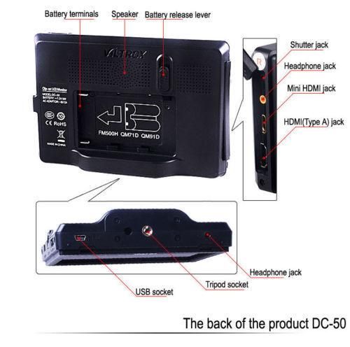 DC-50 - це портативний LCD-монітор від Vittrox, призначений для використання з фотоапаратами в режимі HDMI-термінала або режимі Live view. Він відтворює HDMI-відео на виході фотоапарата.