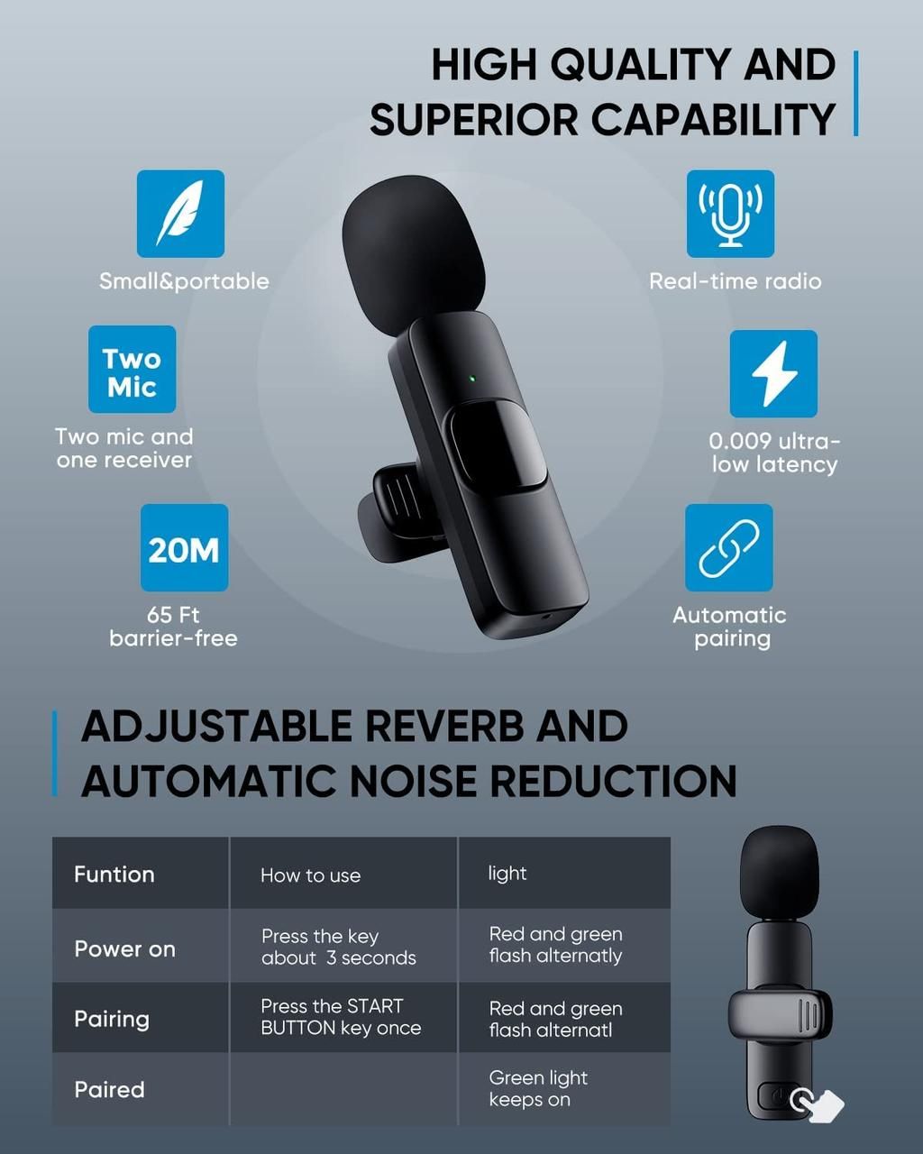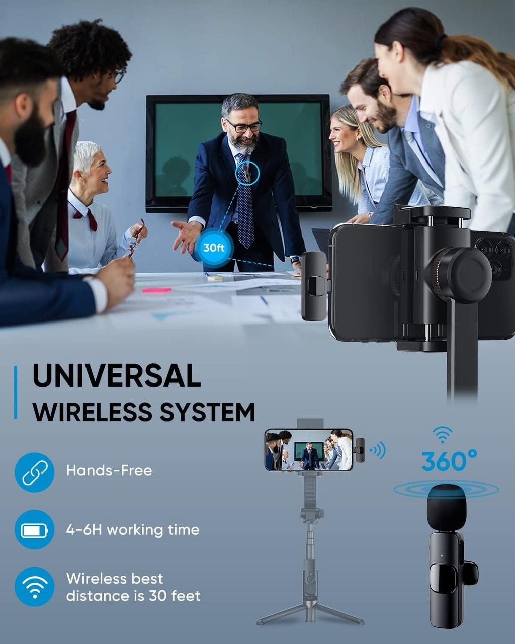 Ця система радіомікрофона складається з приймача (ресивера), що під'єднується до смартфону і з мікрофона петлочки з передавачем, що закріплюється на одязі. Дальність зв'язку через радіоканал становить до 20 метрів за прямої видимості, так що ви зможете використовувати цей радіомікрофон як у приміщенні, так і на вулиці.