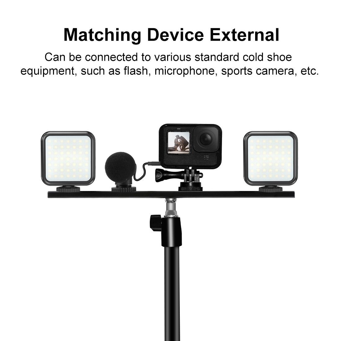 Планка з отворами 1/4 і 3/8 дюйма виготовлена з високоякісного алюмінієвого сплаву з ЧПУ, За допомогою цього пристрою можна встановлювати одночасно від одного до декількох  Три пристрої, такі як світлодіодний накамерний світло, мікрофон, кріплення смартфона і т.п. Має можливість кріплення на будь-який штатив, стійкку, стабілізатор або інший власник з винтом 1/4 або 3/8 дюйма.
