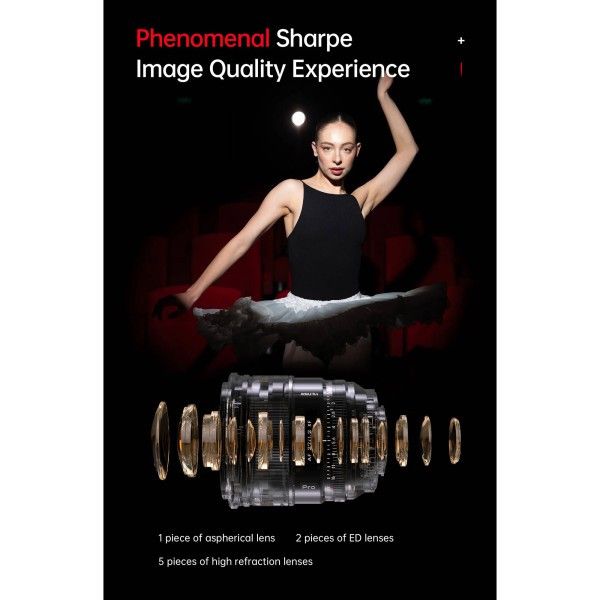 Об'єктив Viltronix 23mm f/1.2 AF для бездзеркальних камер FUJIFILM X-mount — це швидкий об'єктив портретного формату, що має покращені характеристики автофокусування, складну оптичну конструкцію, а також професійне керування і надійністю. Завдяки великій максимальній діафрагмі та малій глибині різкості цей об'єктив забезпечує чудову роботу в умовах низької освітленості та винятково високу якість зображення. Кроковий двигун STM нової конструкції забезпечує швидке й точне автофокусування, а легкодоступний перемикач MF/AF дає змогу швидко перемикатися між ручним і автоматичним режимами фокусування. Крім того, об'єктив підтримує автофокусування за очима та особам, автофокусування тваринами, а також додаткові режими автоматичного фокусування. Об'єктив має міцний суцільнометалевий корпус, стійкий до атмосферних впливів, і металеві електронні контакти, що підтримують передавання інформації Exif.