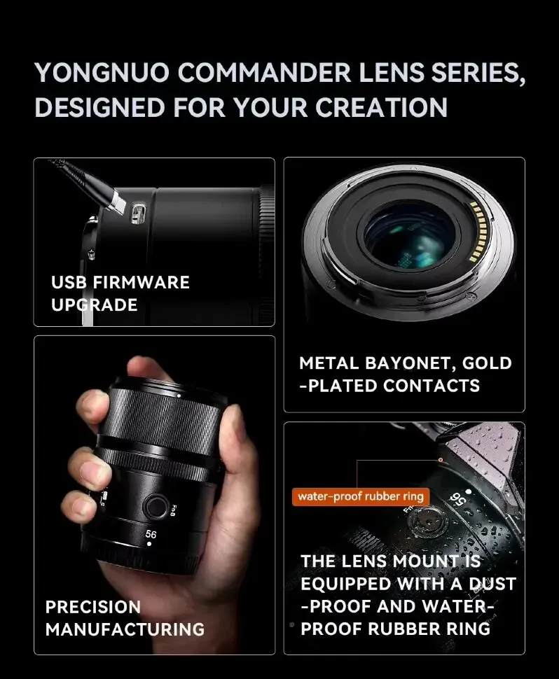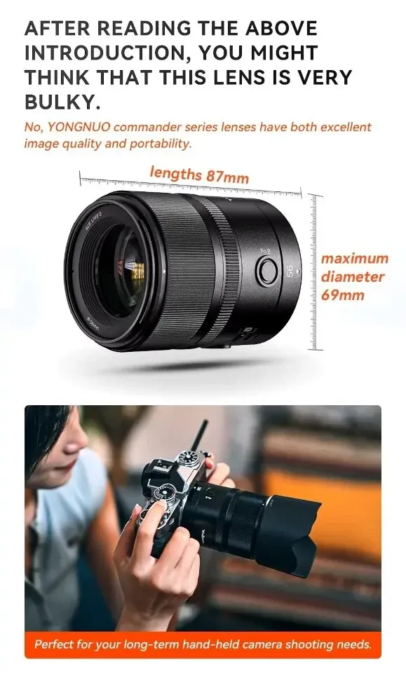 Новинка від Yongnuo дивує. Компактний об'єктив на APS-C камеру вагою всього 375 грамів, поєднує компактність і легкість, що робить його ідеальним для повсякденного використання. Швидкий DSM мотор чудово справляється з різкою зміною плану за мінімального дихання фокусу. Головна фішка — можливість дистанційного керування за допомогою пульта BR-L1 (не входить до комплекту).