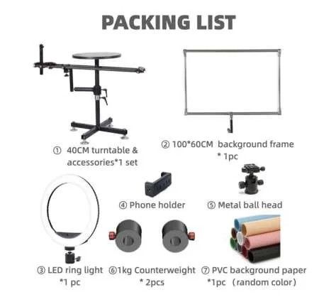 Поворотна, обертова як сферично, так і 360 градусів платформа — стіл із кріпленнями для телефона та камери, кільцевим LED-світлом JingYing-02 — діаметр стола 40 см із максимальним навантаженням до 80 кг.