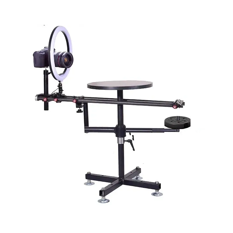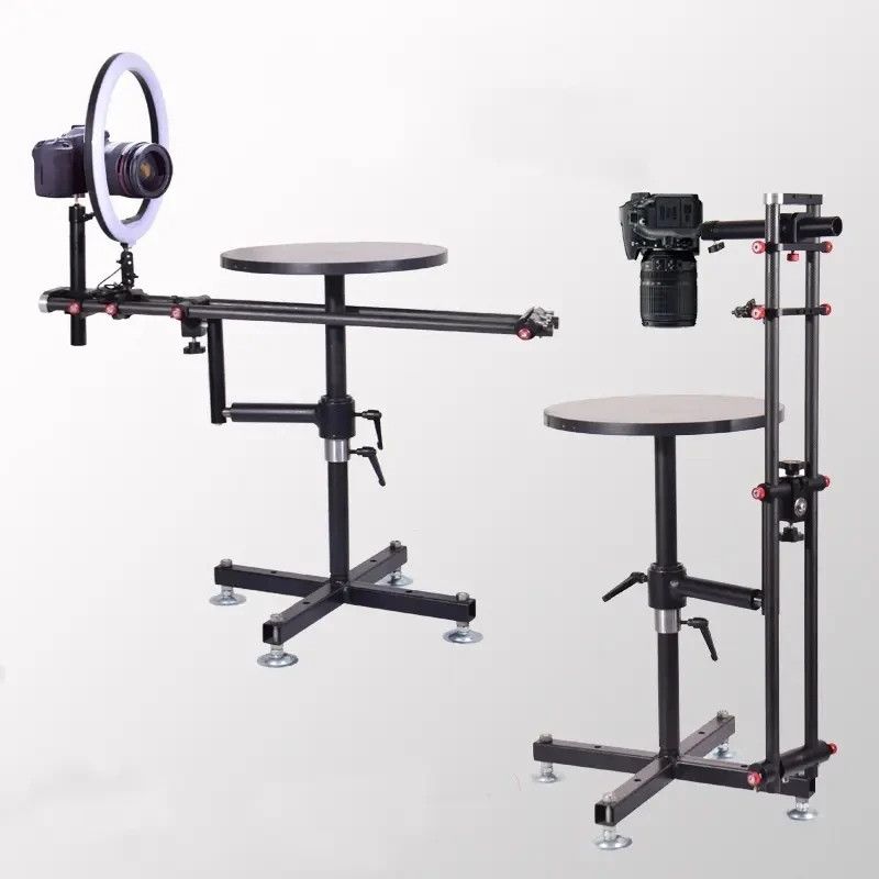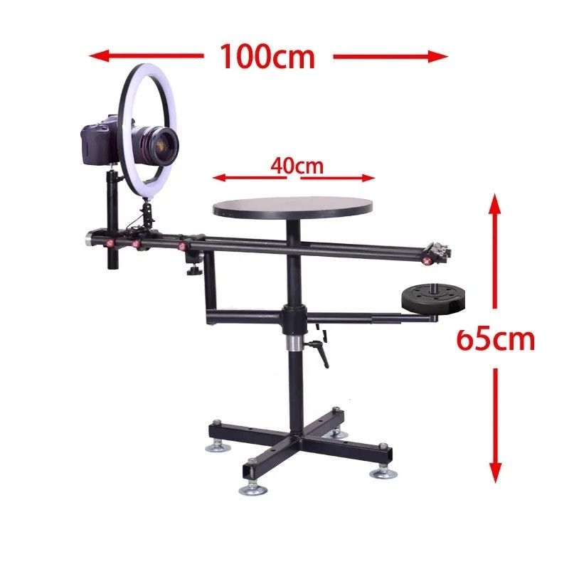 У центрі конструкції розміщений стіл діаметром 40 см, який розрахований на навантаження до 80 кг, довжина кронштейна 100 см матеріал кронштейна карбон із противагою на протилежному боці, за потреби можна встановити рамку фону 100 х 60 см. і встановити додаткові освітлювальні прилади. |