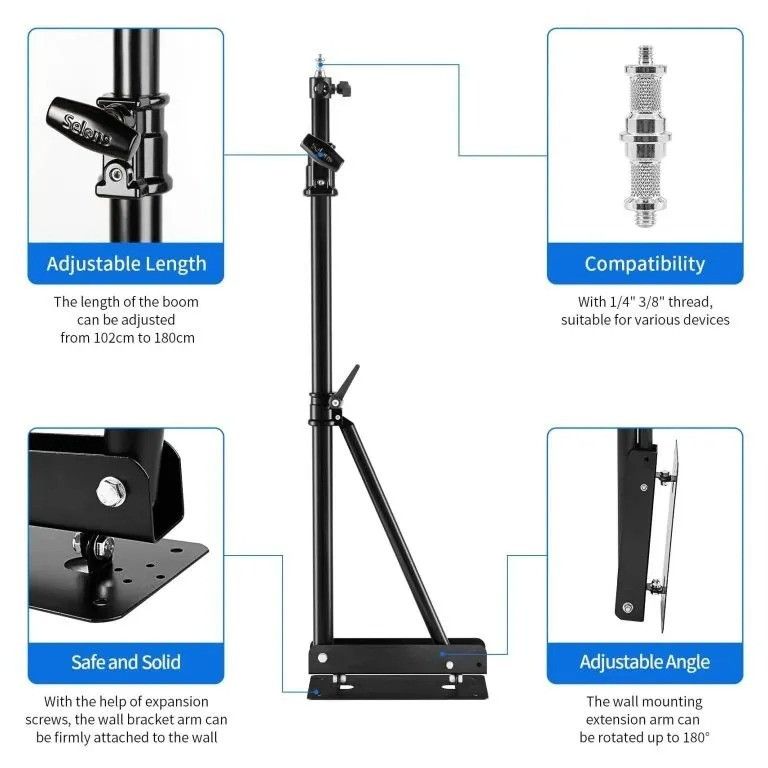 Міцний настінний кронштейн Selens з максимальною довжиною 180 см призначений для кріплення до стіни студійного обладнання, освітлювальні прилади, відбивачі та додаткові спалахи. Регульований кронштейн чудово впишеться в інтер'єр студії або в домашніх умовах, не займаючи багато місця.