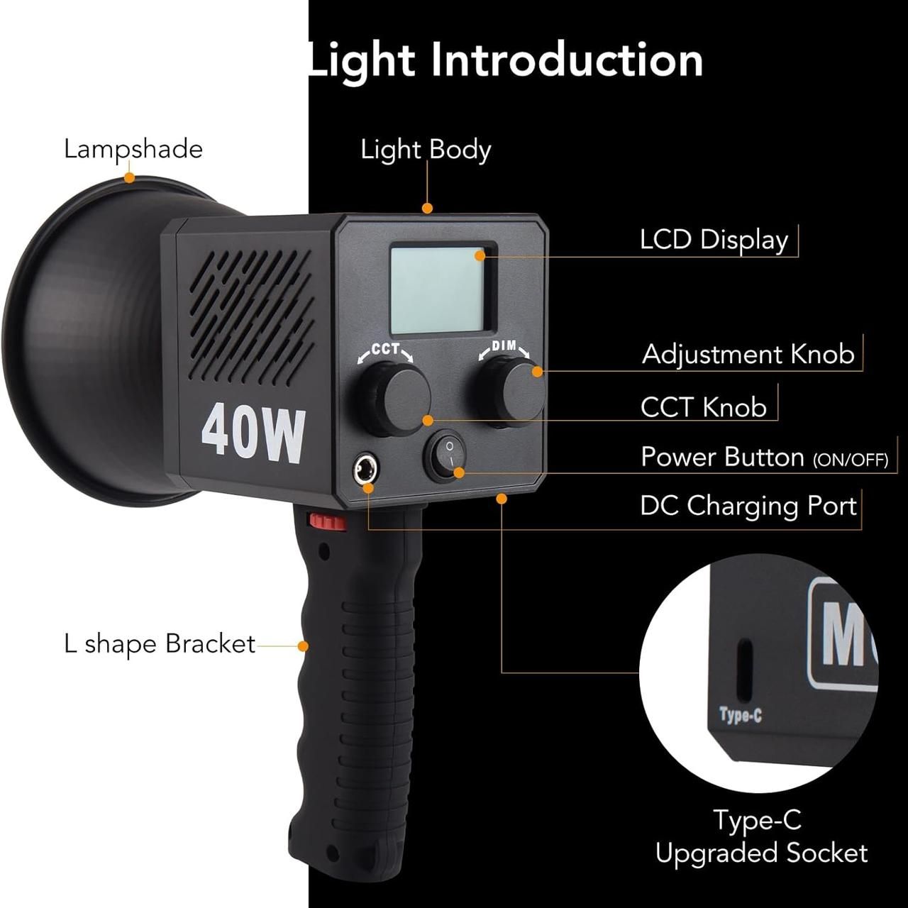 LED-світло, освітлювач, студійне світло M60 40W (2500-6500K) з вбудованим акумулятором на 3400 ma та тримачем