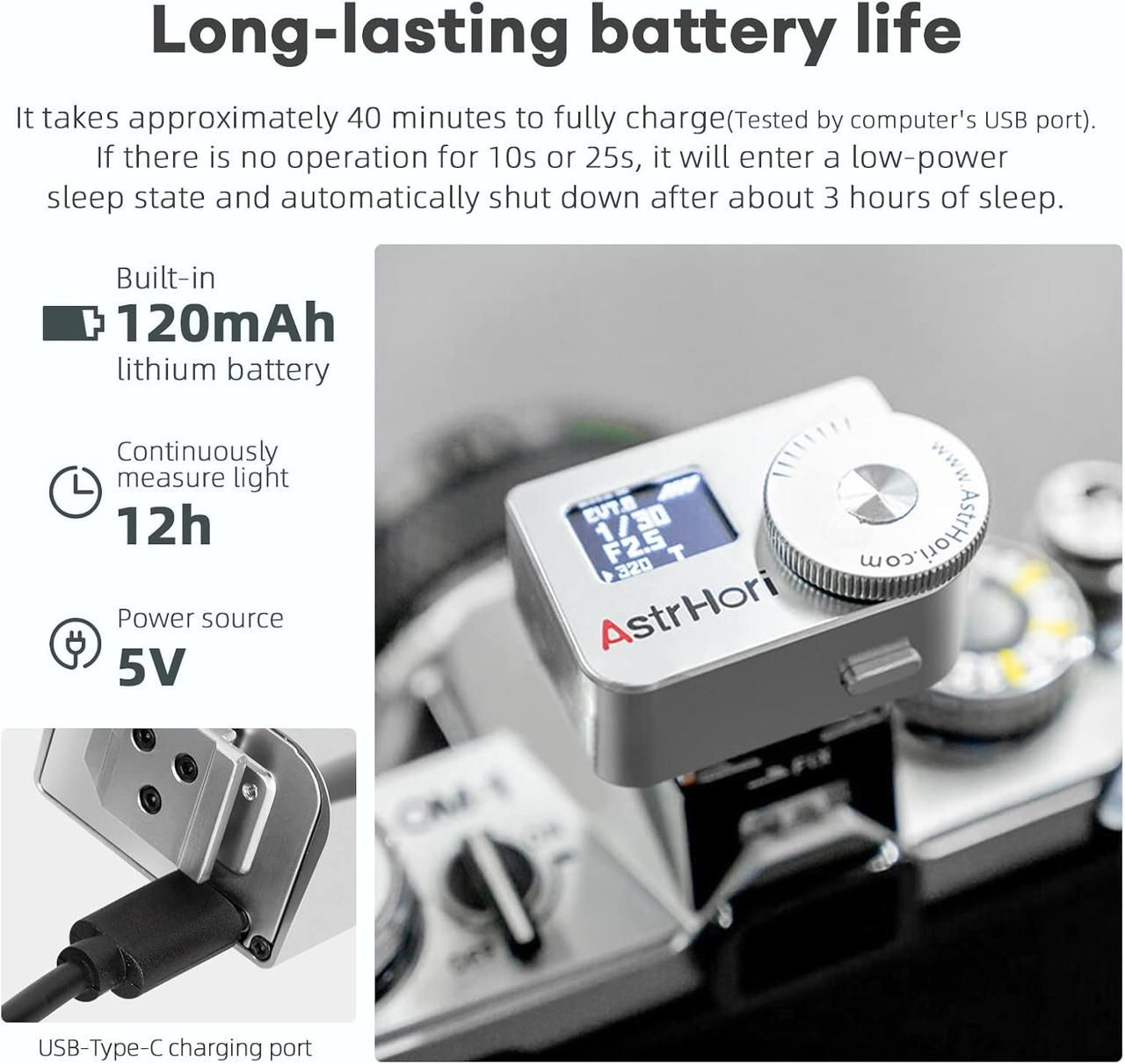 Обладнаний вбудованою літієвою батареєю ємністю 120 мА·год, експонометр AstrHori AH-M1 може працювати впродовж приблизно 12 годин. Заряджання повністю розрядженої батареї відбувається через порт USB-Type-C і займає приблизно 40 хвилин. Якщо впродовж 10 або 25 секунд не відбувається жодних операцій, пристрій перейде в режим очікування з низьким енергоспоживанням і автоматично вимкнеться приблизно через 3 години сну.