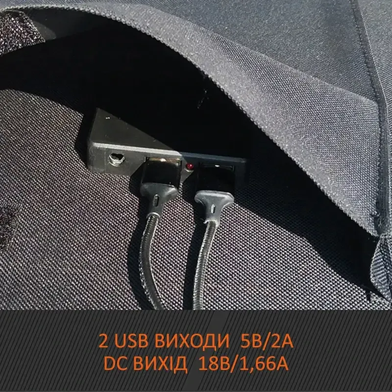 Складаний сонячний зарядний пристрій 30 Вт із виходом USB, обладнаний двома вихідними портами USB, може одночасно заряджати кілька невеликих пристроїв, включно зі смартфонами, планшетами, цифровими камерами тощо. Також у комплекті є 8 адаптерів постійного струму. Його можна використовувати в тандемі з портативними електростанціями. Панель забезпечує високу потужність для заряджання пристроїв у польових умовах для запобігання розряджанню вашого ґаджета. До комплекту входить USB-кабель із загальноприйнятими конекторами microUSB, USB Type-C, Lightning.
