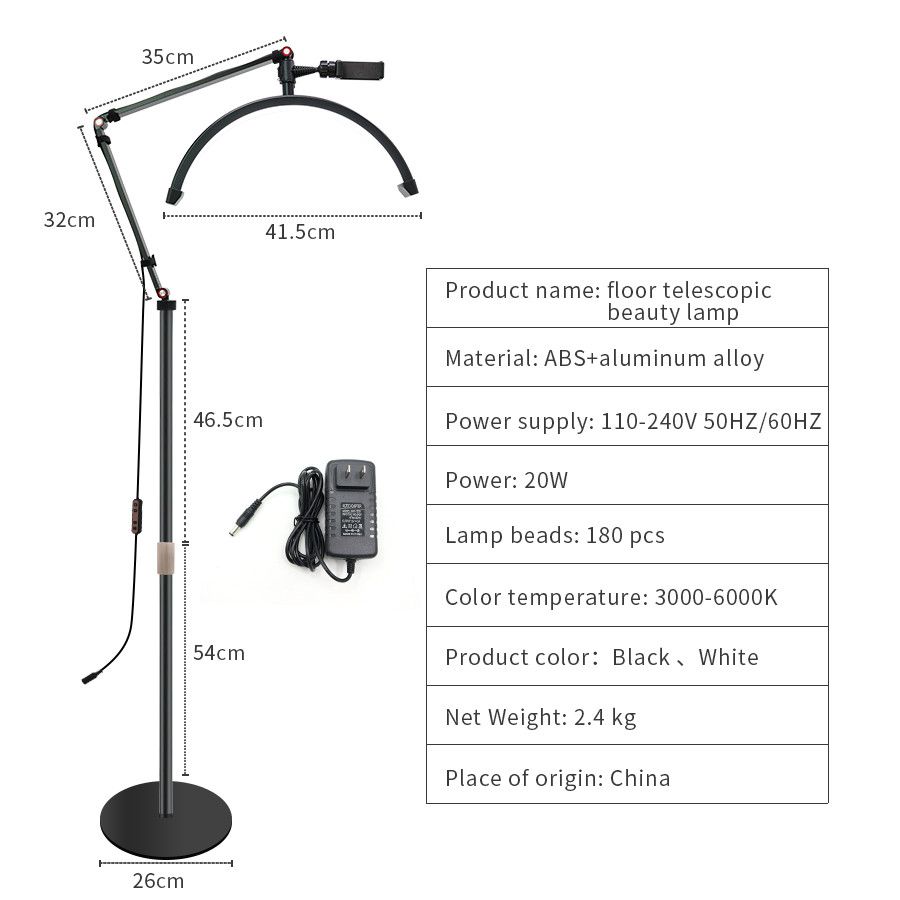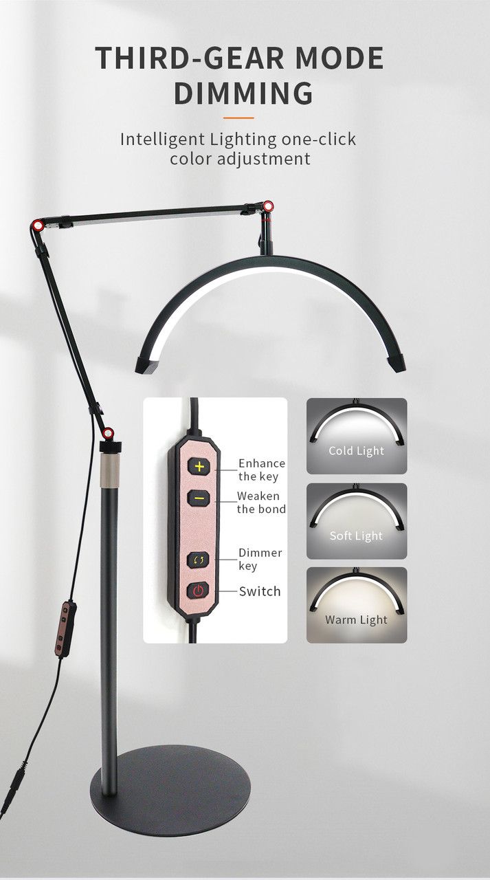 Безтенова підлогова MOON-лампа на з регульованим кріпленням до підлогової стійки з унікальною формою світильника з унікальною формою світильника як дуги — це найкращі варіанти професійного світла для стилістів, візажистів, майстрів із нарощування та ламінування вій, майстрів-бровистів, майстрів татуажу, косметологів та інших фахівців у галузі краси. Це кріплення дає змогу розташувати світильник під різним кутом. Шарнірна стійка має розмір плечей (32 см — 32 см — 23 см) і дає змогу розташувати лампу з необхідним положенням відносно необхідної зони освітлення висота стійки регулюється від 70 до 150 см.
