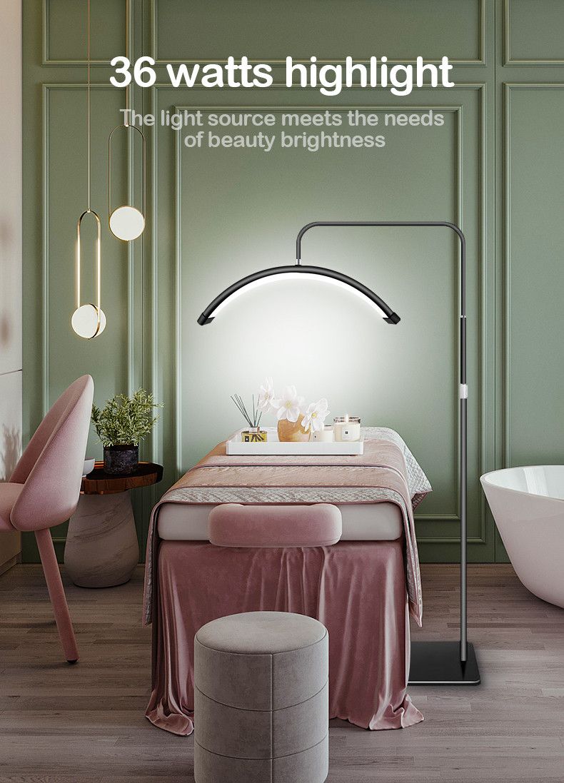 Безтенова лампа на штативі з унікальною формою світильника у формі дуги — це найкращі варіанти професійного світла для стилістів, візажистів, майстрів із нарощування та ламінування вій, майстрів-бровистів, майстрів татуажу, косметологів і інших фахівців у сфері краси.