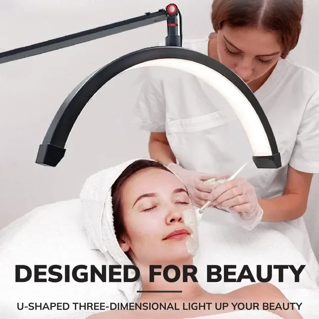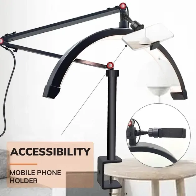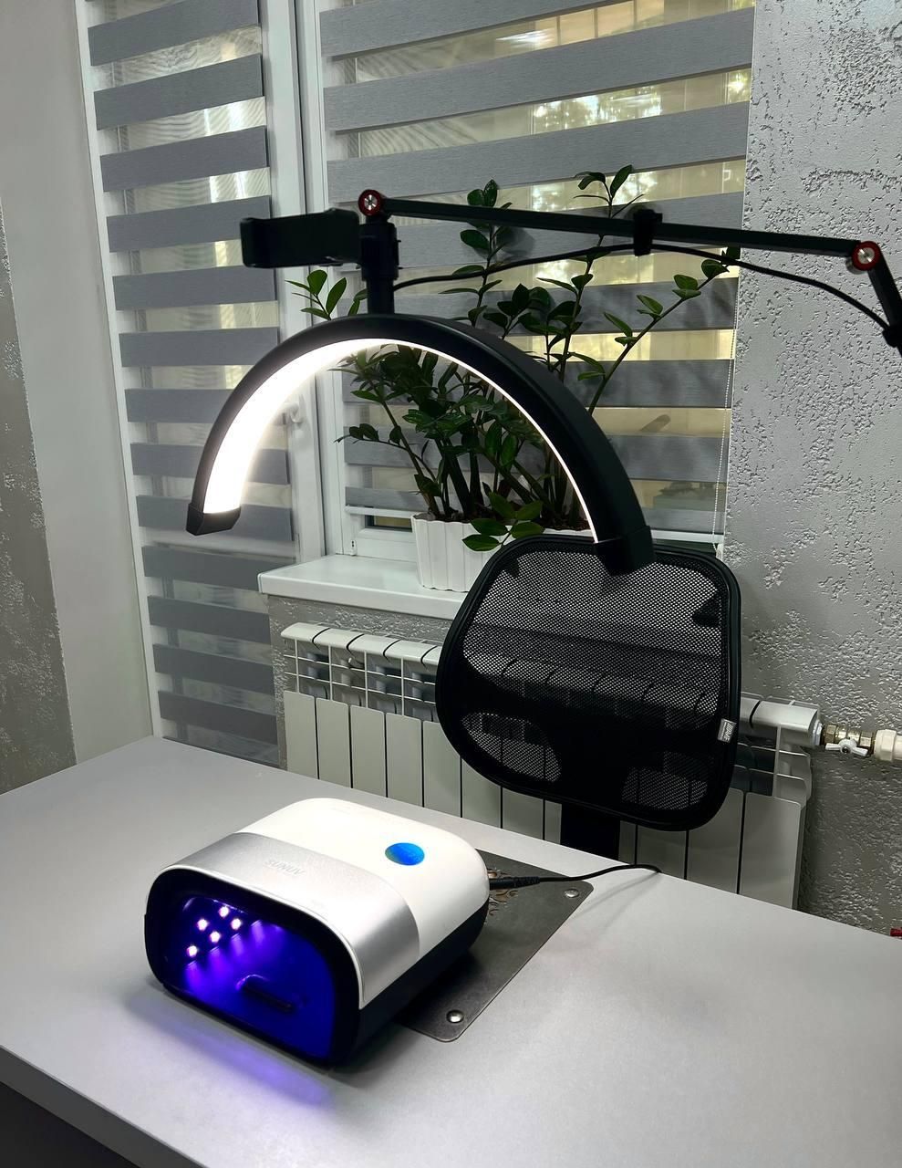 Безтенова лампа на з кріпленням до столу (струбцина) з унікальною формою світильника з унікальною формою світильника як дуги — це найкращі варіанти професійного світла для стилістів, візажистів, майстрів із нарощування та ламінування вій, майстрів-бровистів, майстрів татуажу, косметологів та інших фахівців у галузі краси. Шарнірна стійка з кріпленням до столу має розмір плечей (32 см — 32 см — 23 см) і дає змогу розташувати лампу з необхідним положенням щодо необхідної зони освітлення.