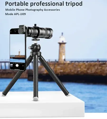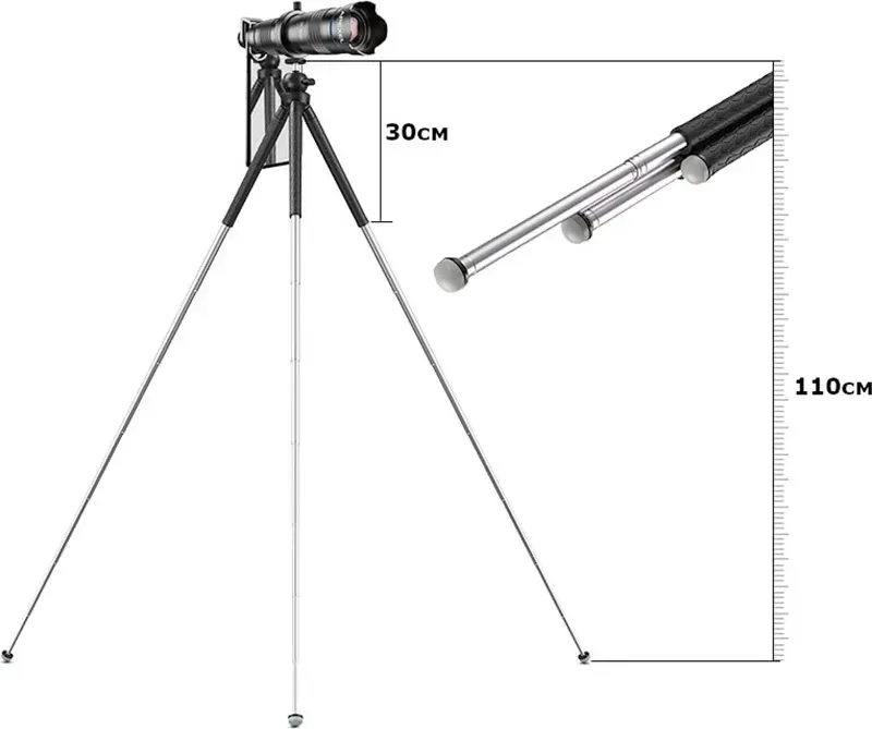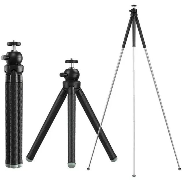 Apexel APL-JJ09Семисекційний телескопічний штатив для телефона з плавним регулюванням висоти від 30 см до 110 см. Обладнаний двома положеннями ширини триног 45° і 30°, перший надає велику висоту, а другий — велику стійкість. У складеному вигляді цей компактний штатив для телефона можна використовувати як тримач, для зручного хвата в цьому положенні ніжки покриті м'яким гумовим шаром. |