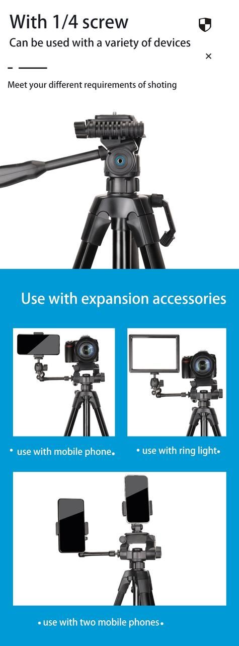 Оптимальний штатив для фото і відео зйомки. Чудова якість виготовлення, високий - робоча висота - 1730 мм. Не велика вага - 1.41 і при цьому максимальна навантаження 4 кілограми - забезпечить використання даного штатива майже з будь-якою камерою і об'єктивом. На штативній головці збоку є додатковий отвір 1/4" що дозволить при необхідності встановити додаткові девайси.