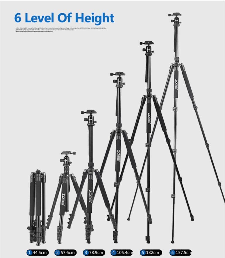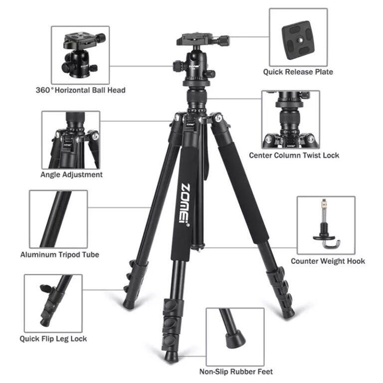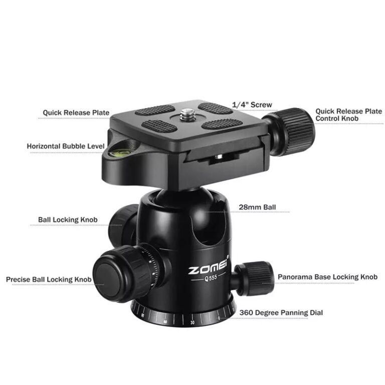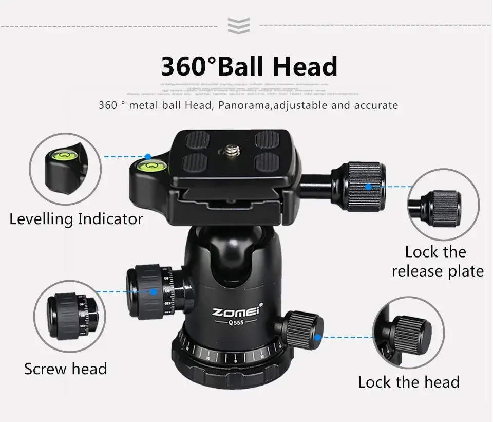 Однією з особливостей штатива Zomei Q555 є застосування дуже простих і зручний фіксаторів висоти та кута нахилу, а також використання спеціальної головки з плавним поворотом на 360o та точним вибором кута нахилу камери в декількох площинах. Остання особливість дає змогу створювати дуже цікаві панорами.