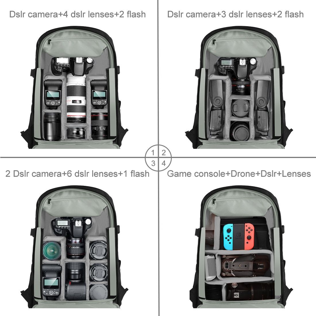 - Вмісність: 1 дзеркальна (беззеркальна) камера, 2-4 об’ єктива, спалах