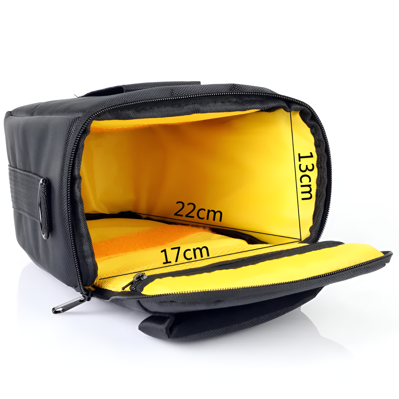 Практична сумка вміщує дзеркальний фотоапарат зі встановленим об'єктивом.