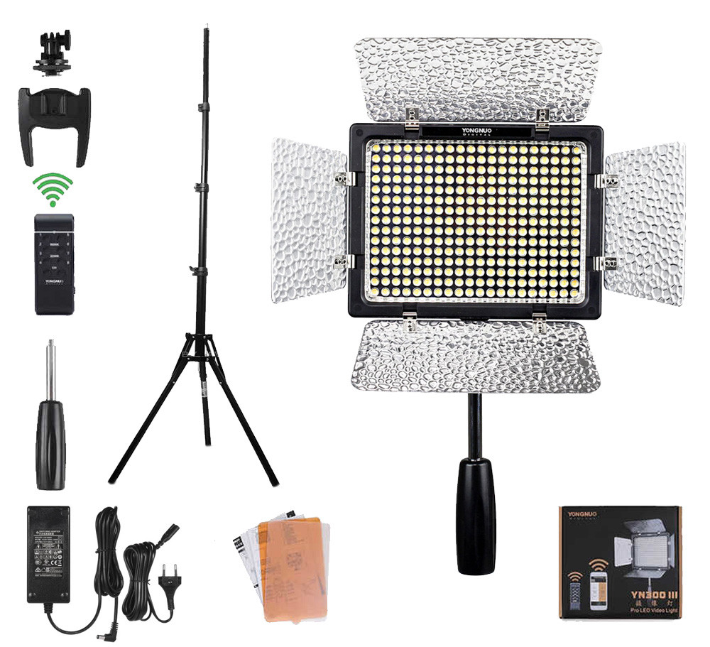 Крім стандартної комплектації LED-світла YN-300 III, до цього комплекту входить мережевий адаптер (забезпечує роботу Вашого світла від мережі 220 В), стійка (розсувна від 70 см — 2 метрів), фоторефлектор (відбивач) 2 в 1 60 см (білий-золото)