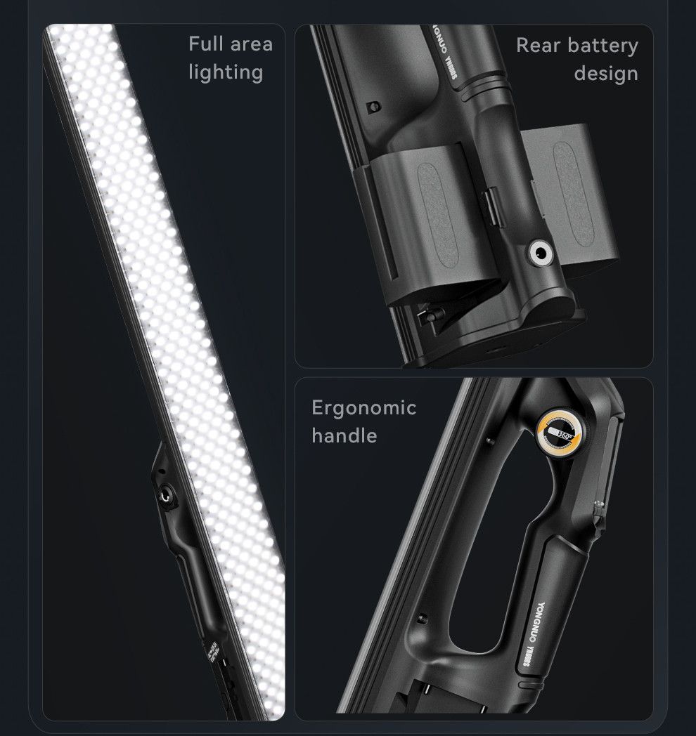 YN660S LED побудований на алюмінієвій рамі, яка ефективно відводить тепло. Світильник має зручну ручку та може керуватися однією рукою. На ручці передбачений великий екран, на якому зображаються параметри та параметри світла. Також на ручці розташоване колесо для керування лампою.
