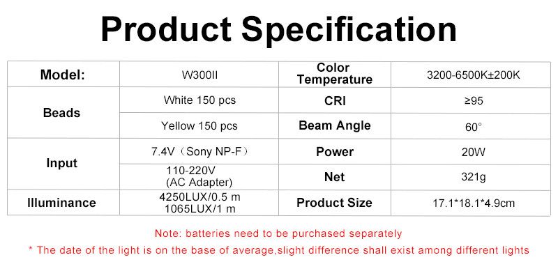 Виготовлений у легкому та тонкому корпусі вага панелі становить усього 321 грам, тому його зручно використовувати як на камері, так і в не її. Має чудові рефлектори для напрямку світлового потоку. Під час перенесення вони чудово захищають LED-діоди. WS-300 II забезпечує м'яке світло та широкий кут освітлення так само має високий індекс кольоропередавання, що робить його гарним заповнювальним джерелом із близької відстані. Є можливість плавного та грубого налаштування потужності? а також регулювання температури в діапазоні 3200K-6500K. Також відмітною особливістю цієї моделі є наявність мережевого адаптера в комплекті постачання та наявність 3 кольорових світлофільтрів-розсіювачів. За потреби ви також можете використовувати акумулятори NP-F серії — різної ємності — є в нас у магазині.