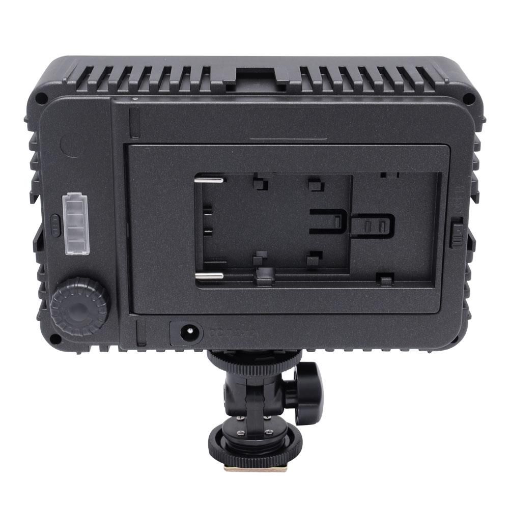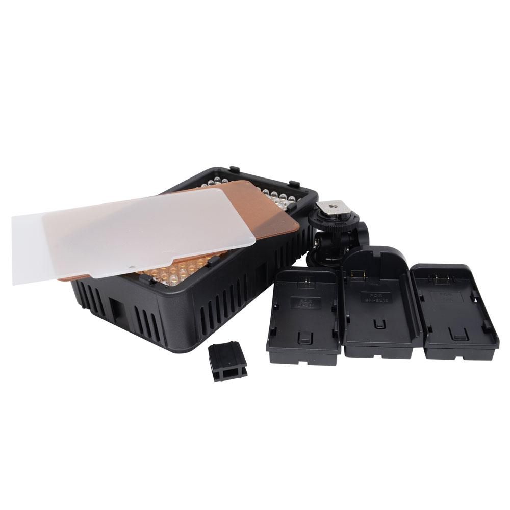 У накамерному світлі використані найновіші світлодіоди з коефіцієнтів Cri>95 одиниць, що дають яскраве і рівномірне світло. Завдяки розташуванню світлодіодів можна успішно знімати 16х9. Тут є диммер, звужений з кл/викл, а також індикатор заряду акумулятора (4 світлодіода і кнопка перевірки). У комплекті зі світлом йдуть два світлофільтри (білий розсіює і оранжевий), ніжка для встановлення ліхтаря на гарячий башмаак камери або штатив (з’єднує кілька ліхтарів у панель).