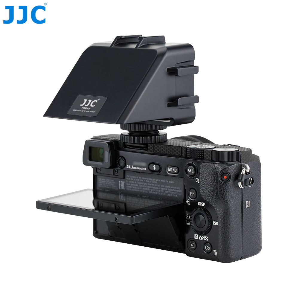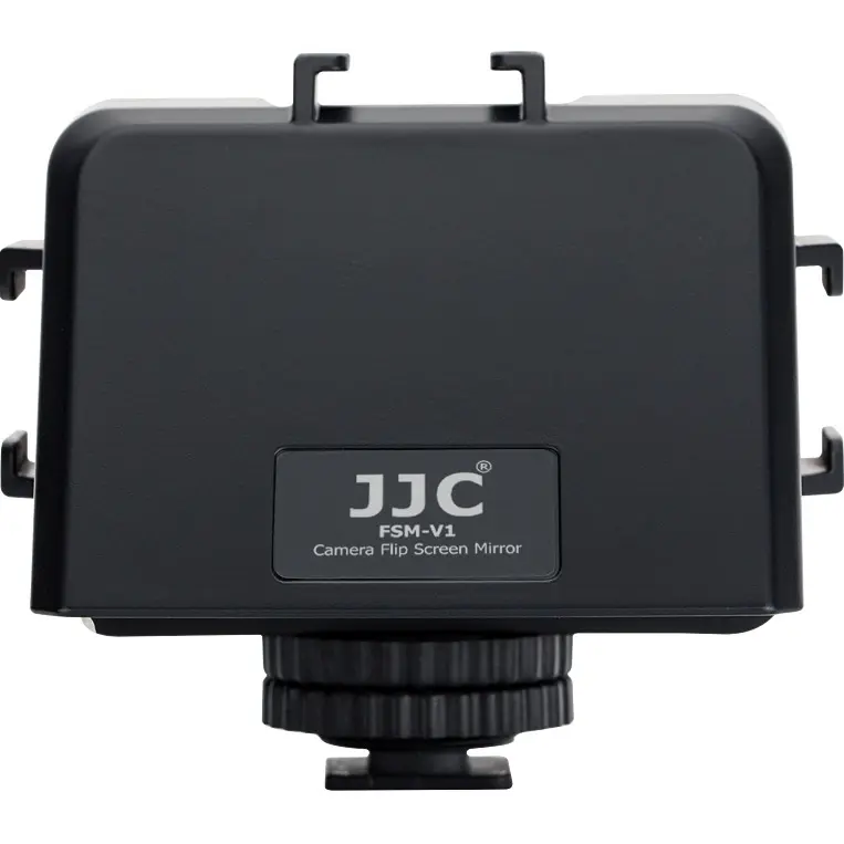 Дзеркало JJC FSM-V1 з відкидним екраном для камери використовує принцип візуалізації periscope та спеціально розроблене для відеознімання, блогу та трансляцій у реальному часі. Просто вставте його в гарячий башмак камери та поверніть екран камери в горизонтальне положення. Зображення на екрані буде зображатися в дзеркалі. Регульований слот дає змогу дзеркалу з відкидною кришкою переміщатися вліво або вправо відповідно до різних позицій дисплея вашої камери. Адаптер для гарячого башмака постачається з регулювальними ручками. Верхнє регулювання ручка може зафіксувати основний корпус відкидного дзеркала, а нижня-закріпити відкидне дзеркало на гарячий башмак камери. На корпусі є 3 стандартні кріпленнями тип "гарячий башмак" з їх допомогою можна встановити накамерне LED-світло, мікрофоном та інші аксесуари.