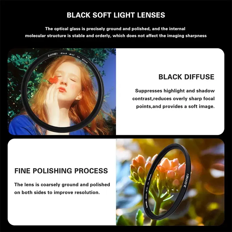Світлофільтр Zomei mm Black Mist 1/4 - створює повітряний ефект димки або туману: пом'якшують контрастність картинки, згладжує зморшки на обличчі і дефекти шкіри, а навколо джерел світла з'являється специфічне кало, яке створює особливу атмосферу в кадрі. Це дає змогу краще реалізувати "м'які" й туманні ефекти, як у кіно. Він також має високий коефіцієнт пропускання з мінімальним впливом на експозицію.
