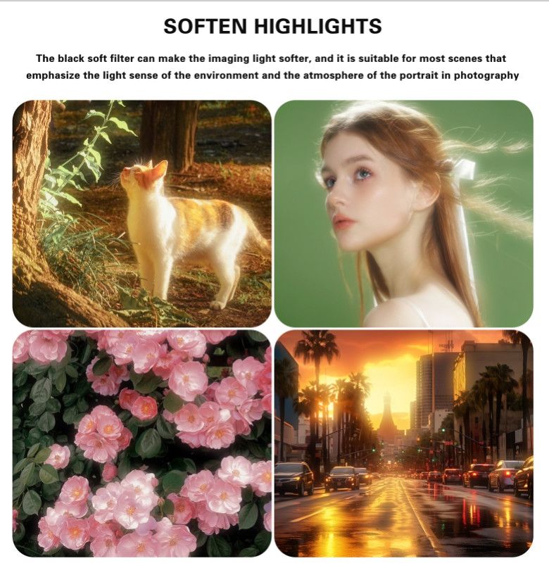 Світлофільтр Zomei mm Black Mist 1/4 - створює повітряний ефект димки або туману: пом'якшують контрастність картинки, згладжує зморшки на обличчі і дефекти шкіри, а навколо джерел світла з'являється специфічне кало, яке створює особливу атмосферу в кадрі. Це дає змогу краще реалізувати "м'які" й туманні ефекти, як у кіно. Він також має високий коефіцієнт пропускання з мінімальним впливом на експозицію.