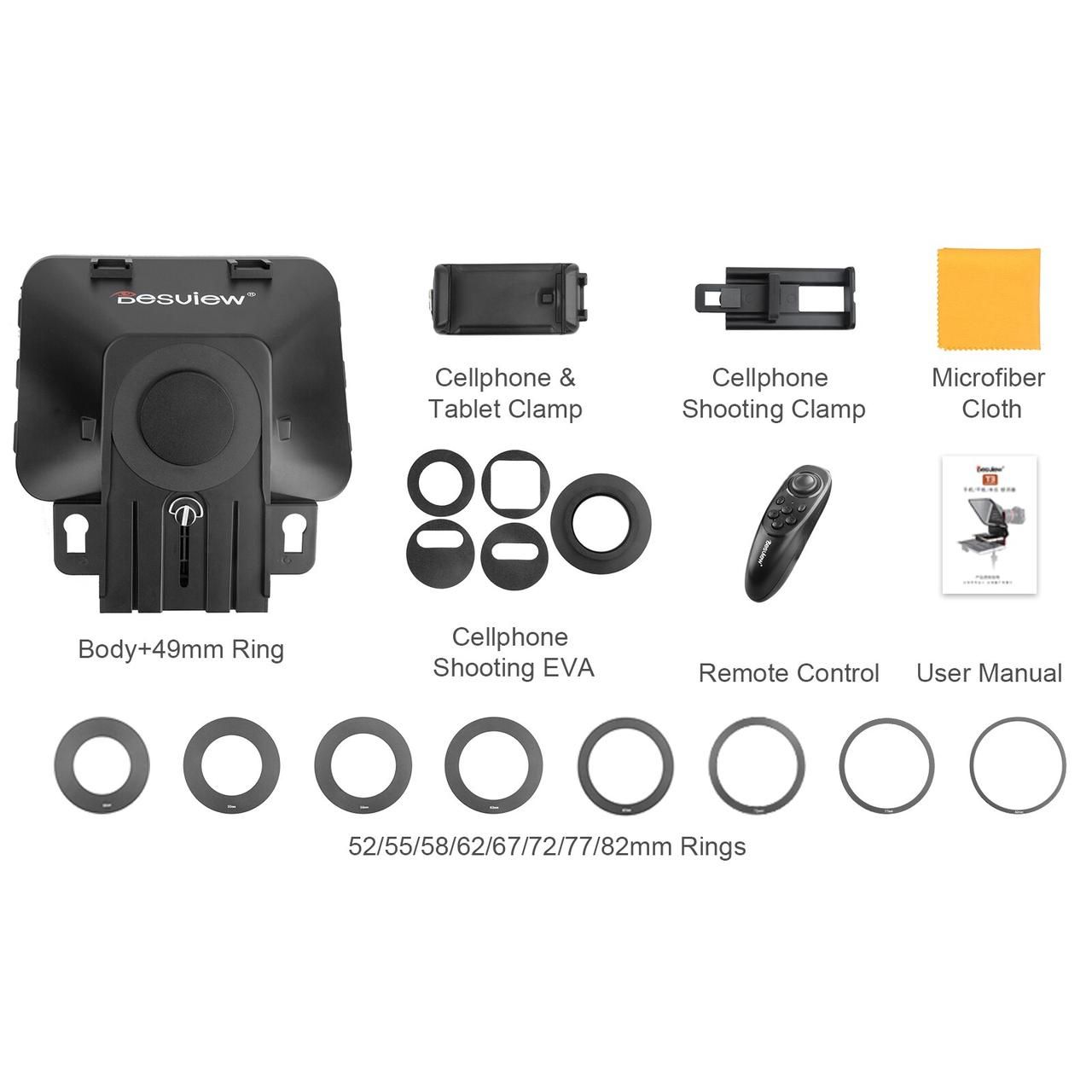 - Сумісні кільця камери 49-82 мм, що робить з'єднання DSLR камери та телесуфлера дуже щільним.
